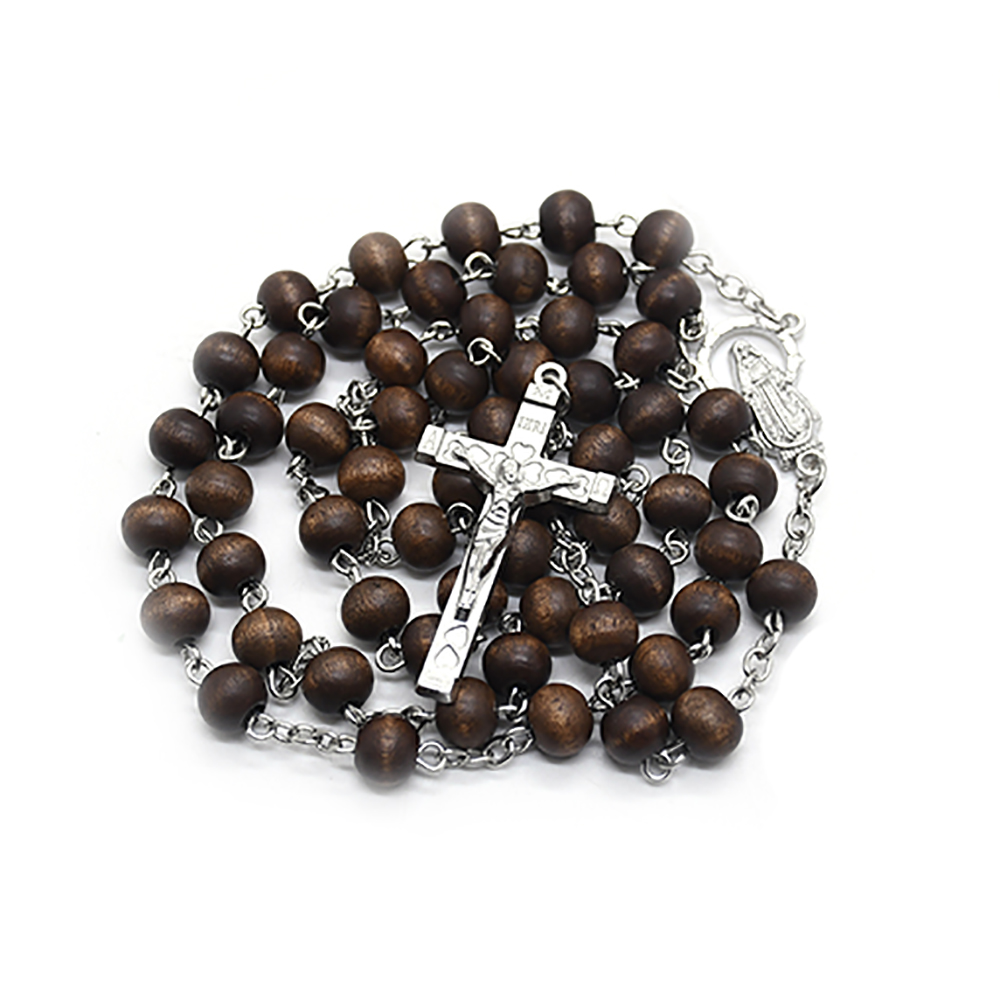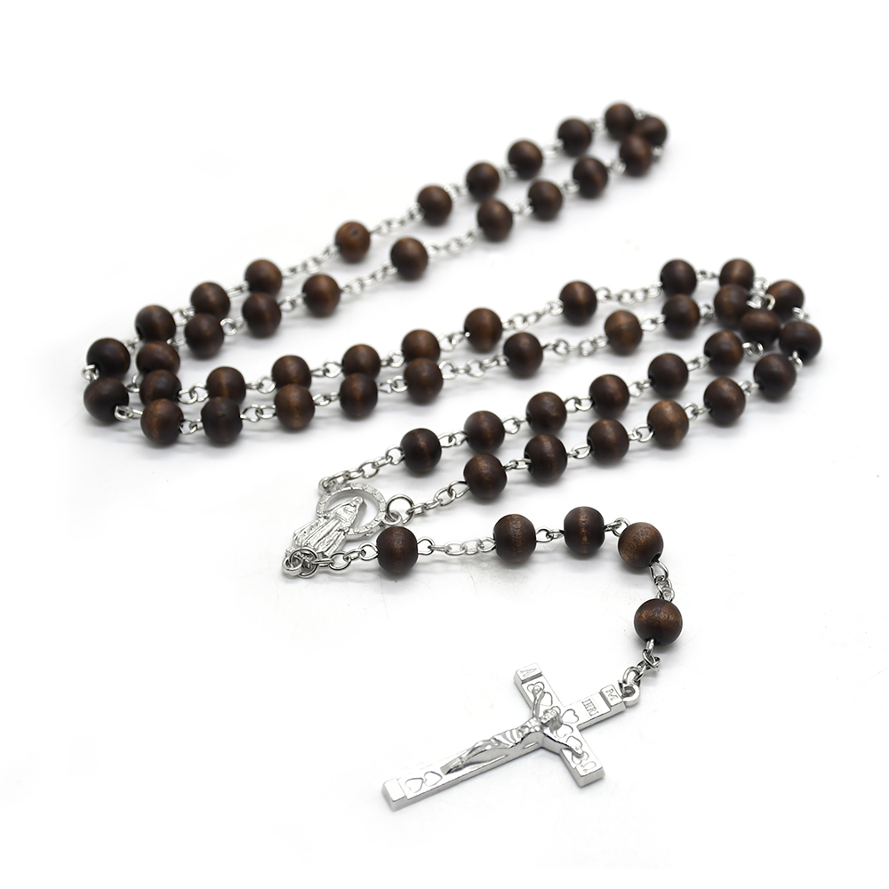 電商貨源棕色木珠念珠項鏈十字架念珠飾品純手工彎針珠鏈禮品