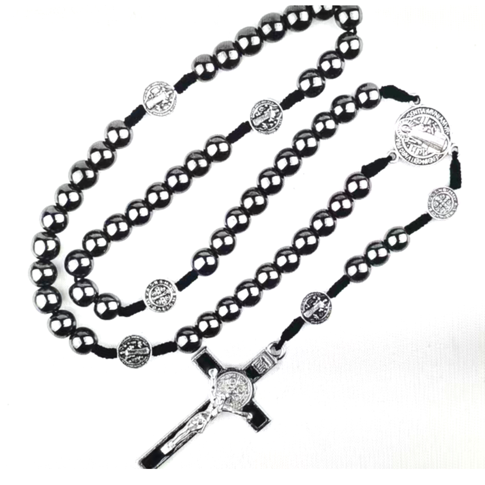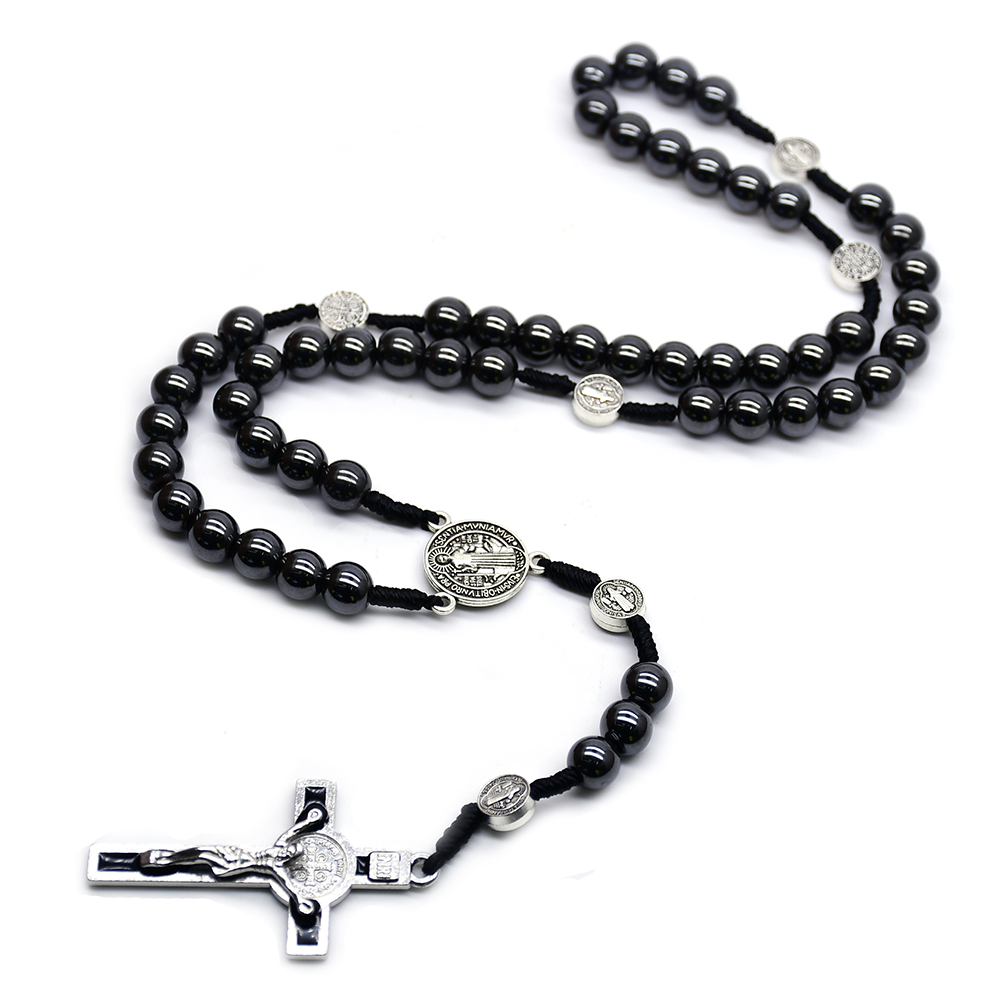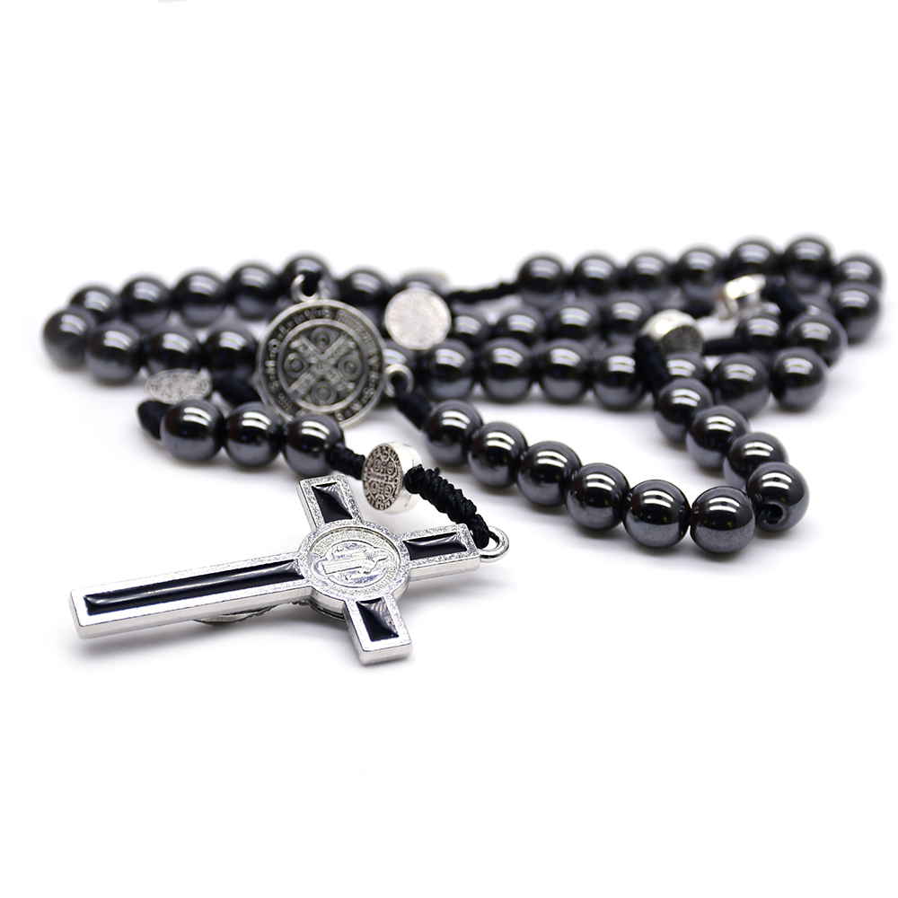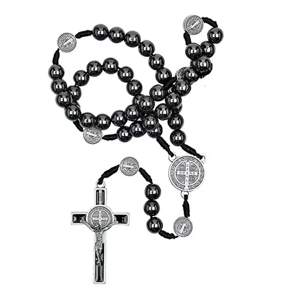 跨境廠家貨源無磁性黑膽石念珠項鏈復古十字架項鏈批發(fā)