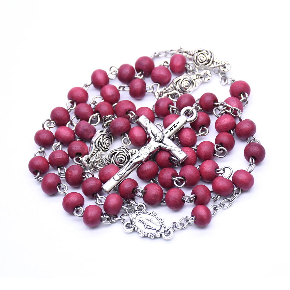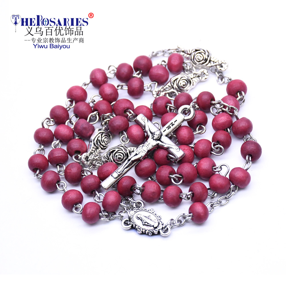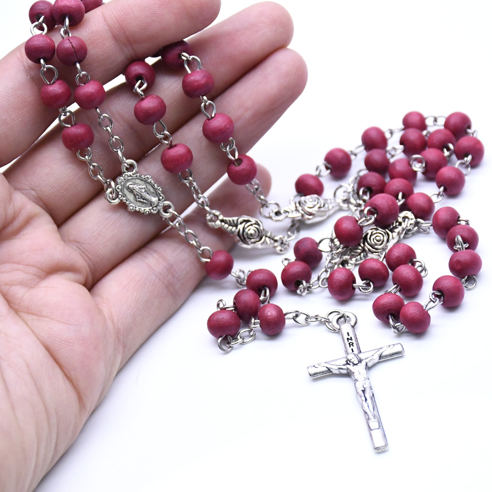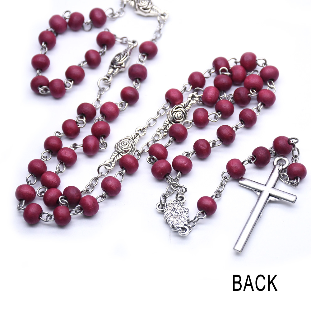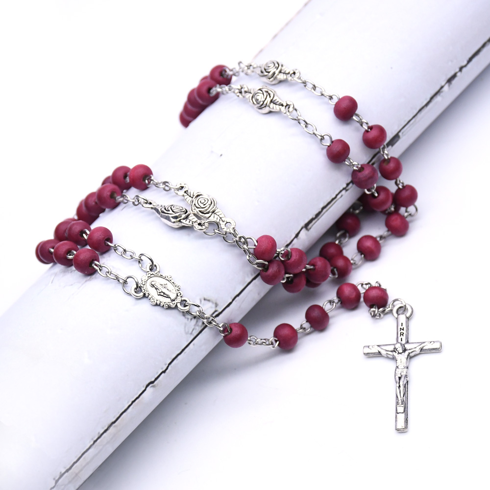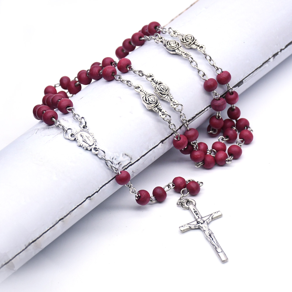 AMAZON跨境外貿(mào)飾品 酒紅十字架紅木珠念珠項鏈 珠鏈