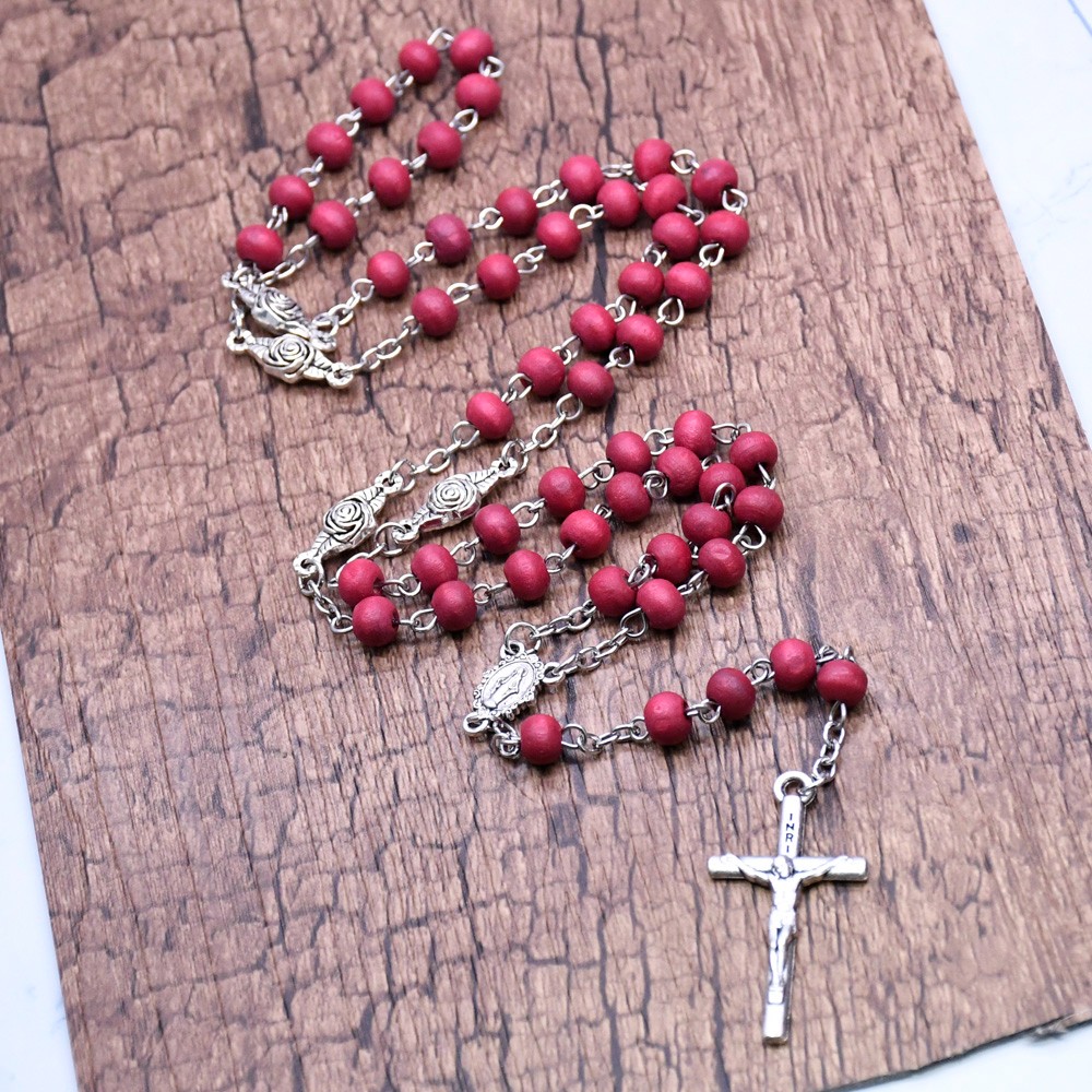 跨境電商 香味珠酒紅色玫瑰念珠項鏈瑪麗亞十字架飾品