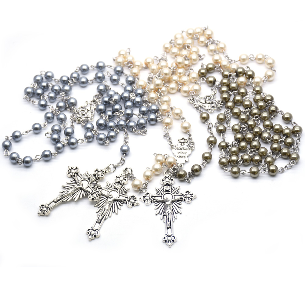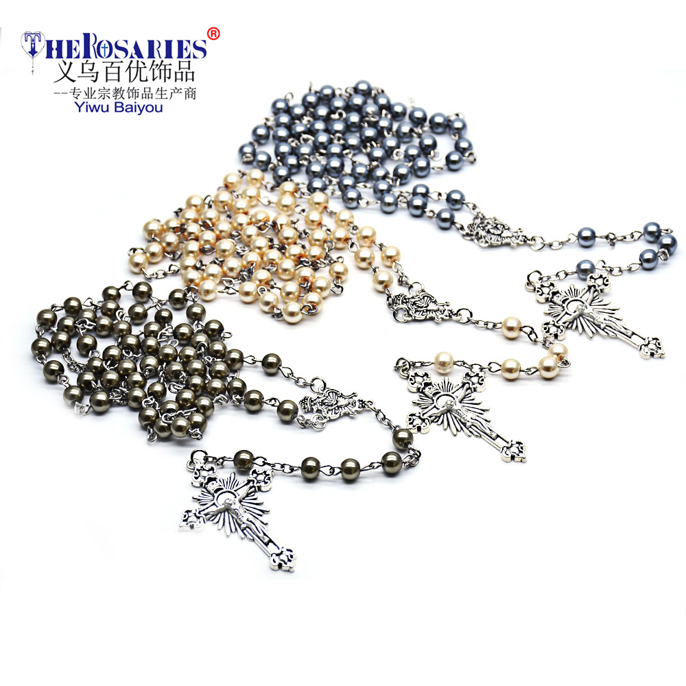 訂做款500條起 外貿(mào)特色產(chǎn)品6mm復(fù)古念珠項(xiàng)鏈三色珍珠十字架飾品