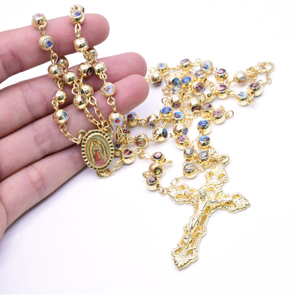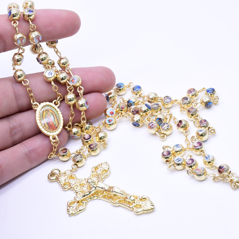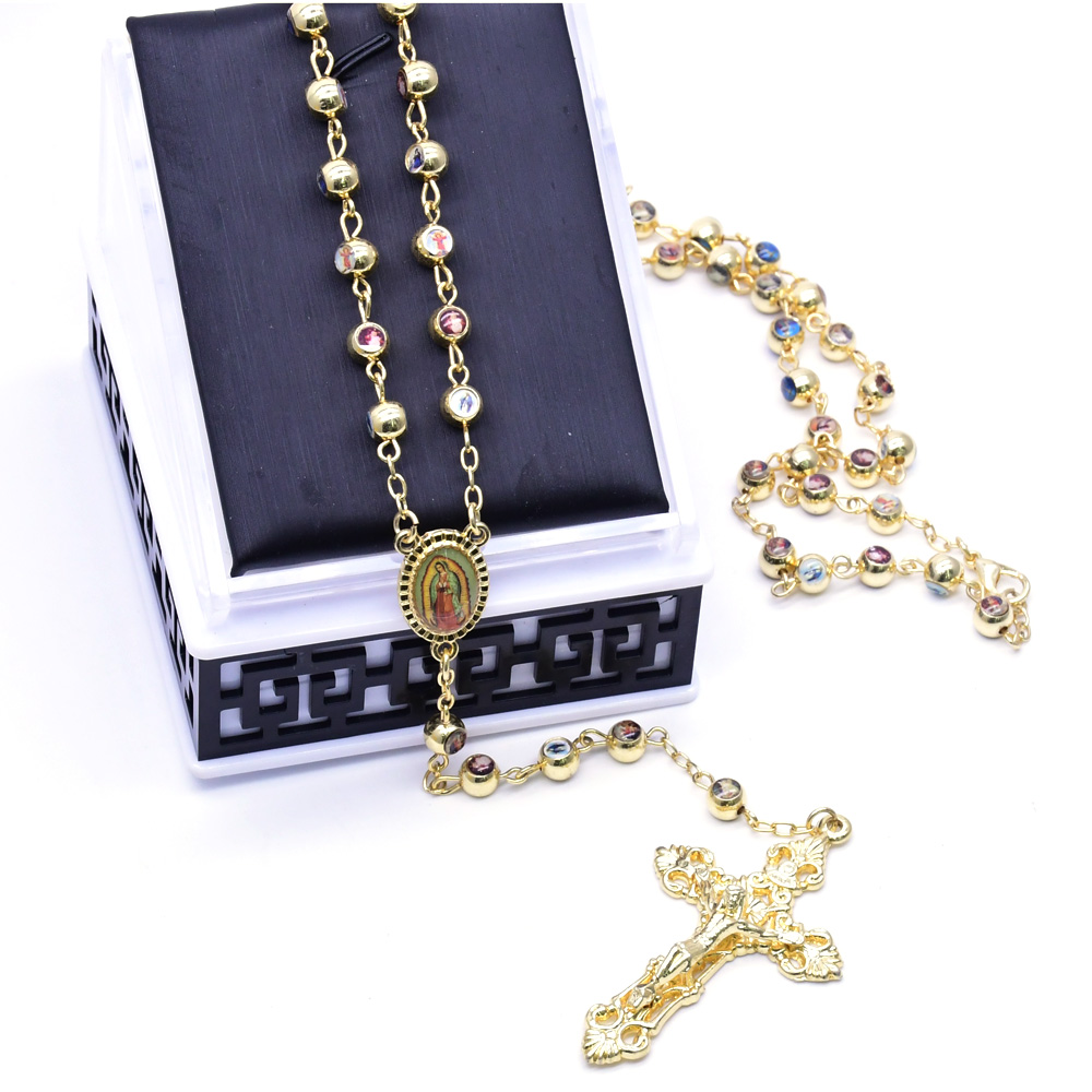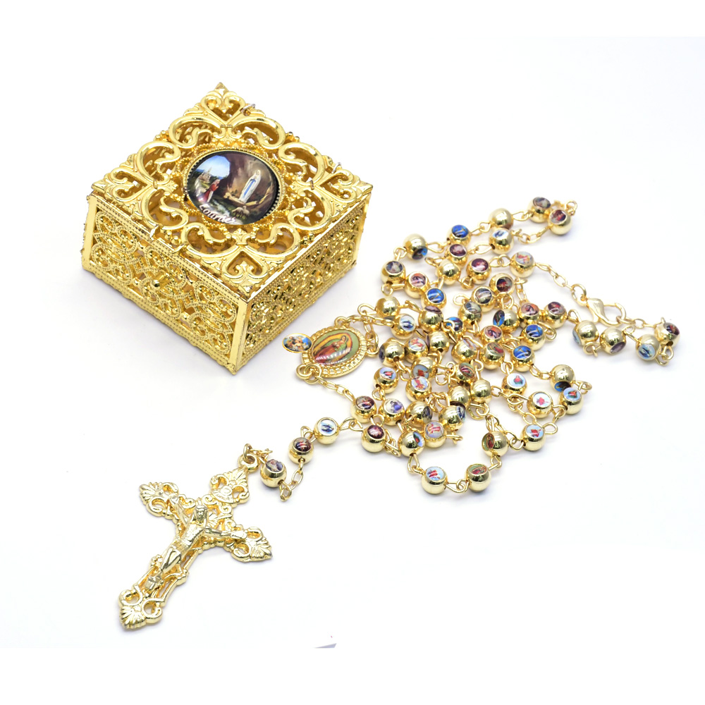 訂做500條起 真金電鍍念珠金屬盒裝高檔禮品十字架項鏈6mm圣像貼紙念珠祈禱珠