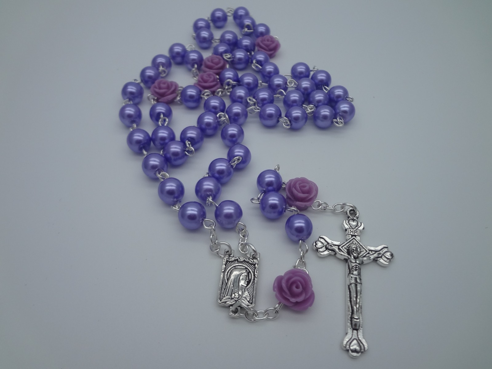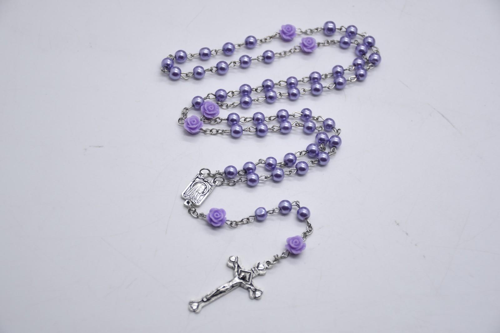 (紫色)8mm玫瑰花珍珠十字架念珠飾品批發(fā)多色選