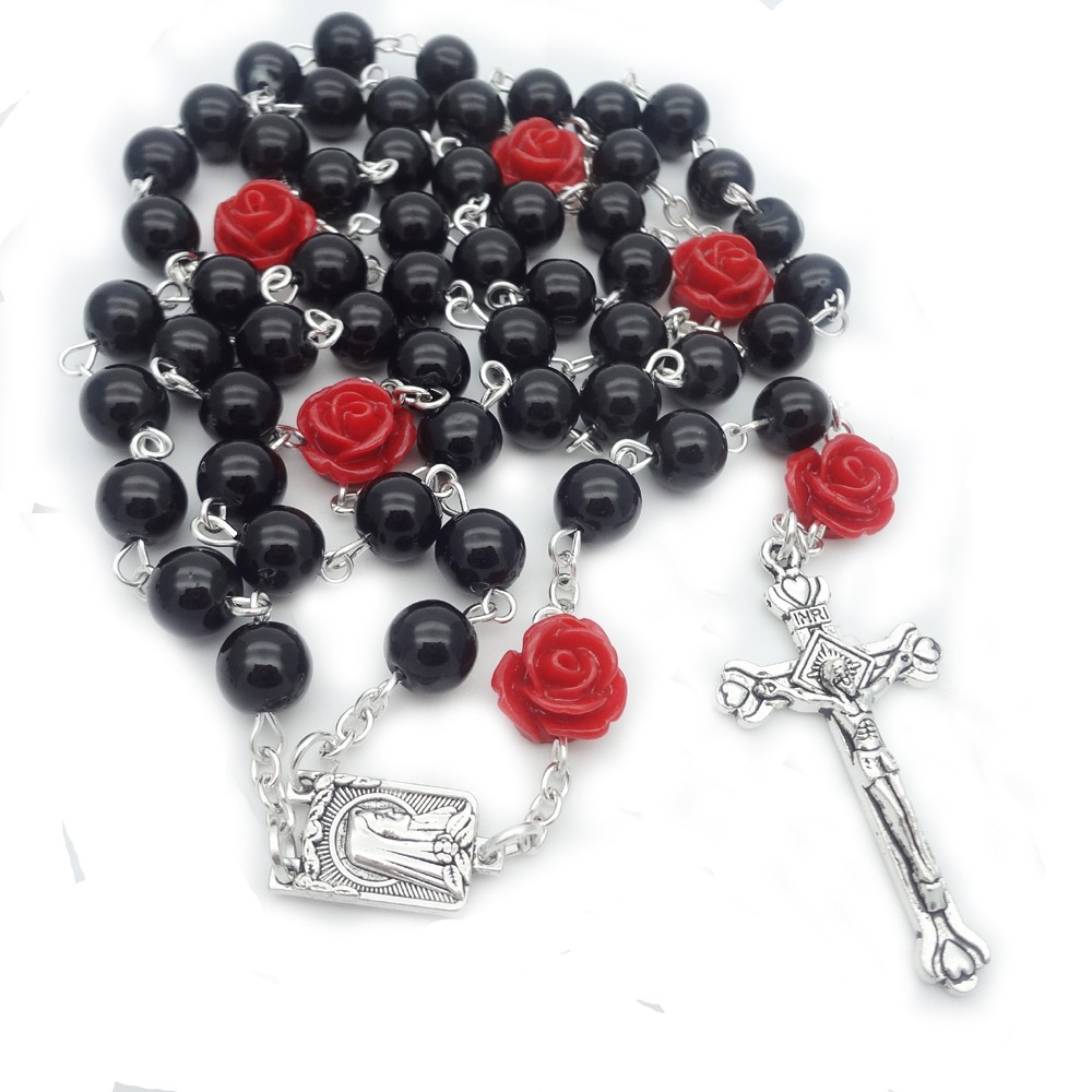 (黑色)6mm玫瑰花珍珠念珠項鏈十字架基督天主教飾品