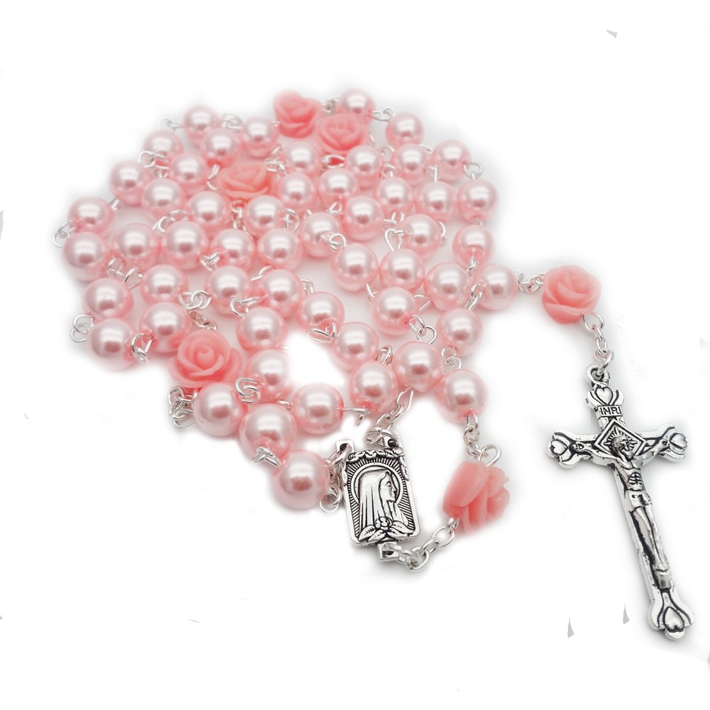 (白色)6mm玫瑰花珍珠十字架念珠項鏈59顆祈禱珠