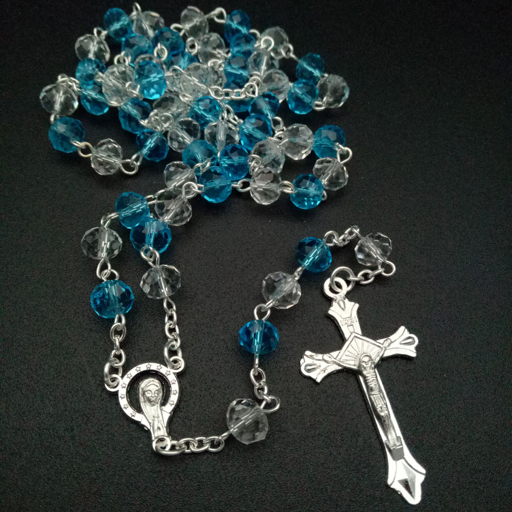 電商外貿(mào)產(chǎn)品8mm藍色水晶念珠十字架項鏈禮品批發(fā)