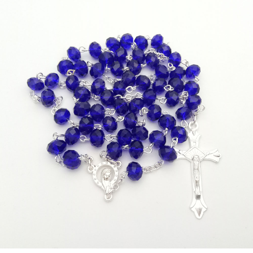 電商外貿(mào)產(chǎn)品8mm藍(lán)色水晶念珠十字架項(xiàng)鏈禮品批發(fā)