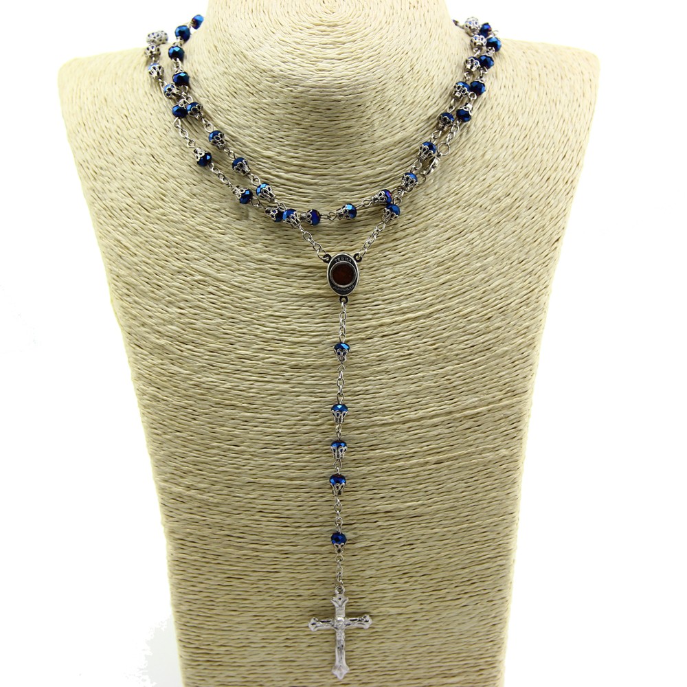 電商外貿(mào)產(chǎn)品8mm藍(lán)色水晶念珠十字架項(xiàng)鏈禮品批發(fā)