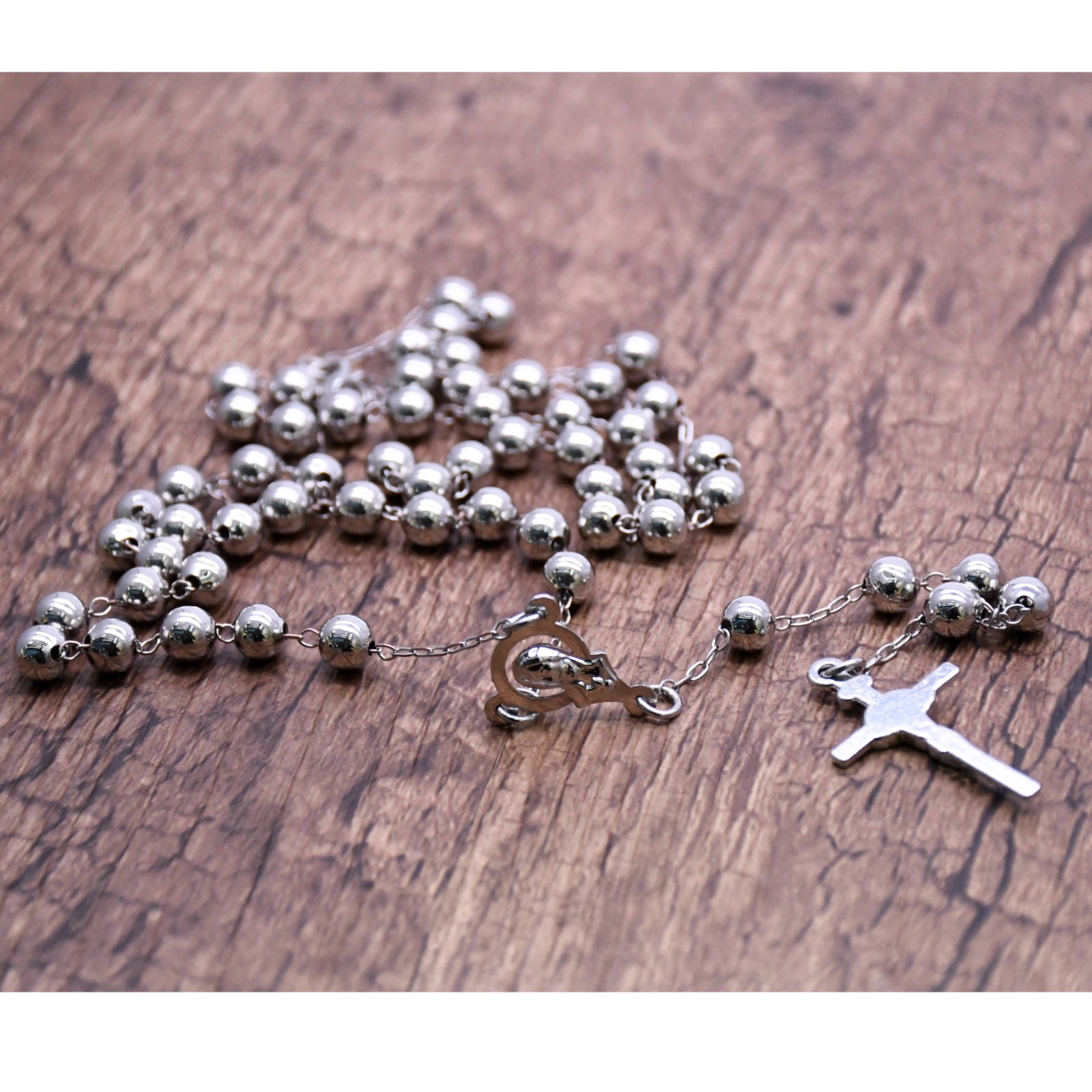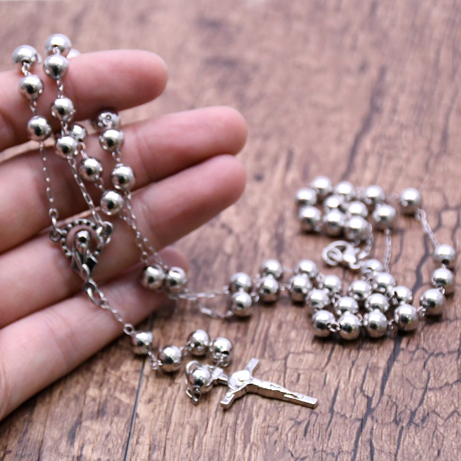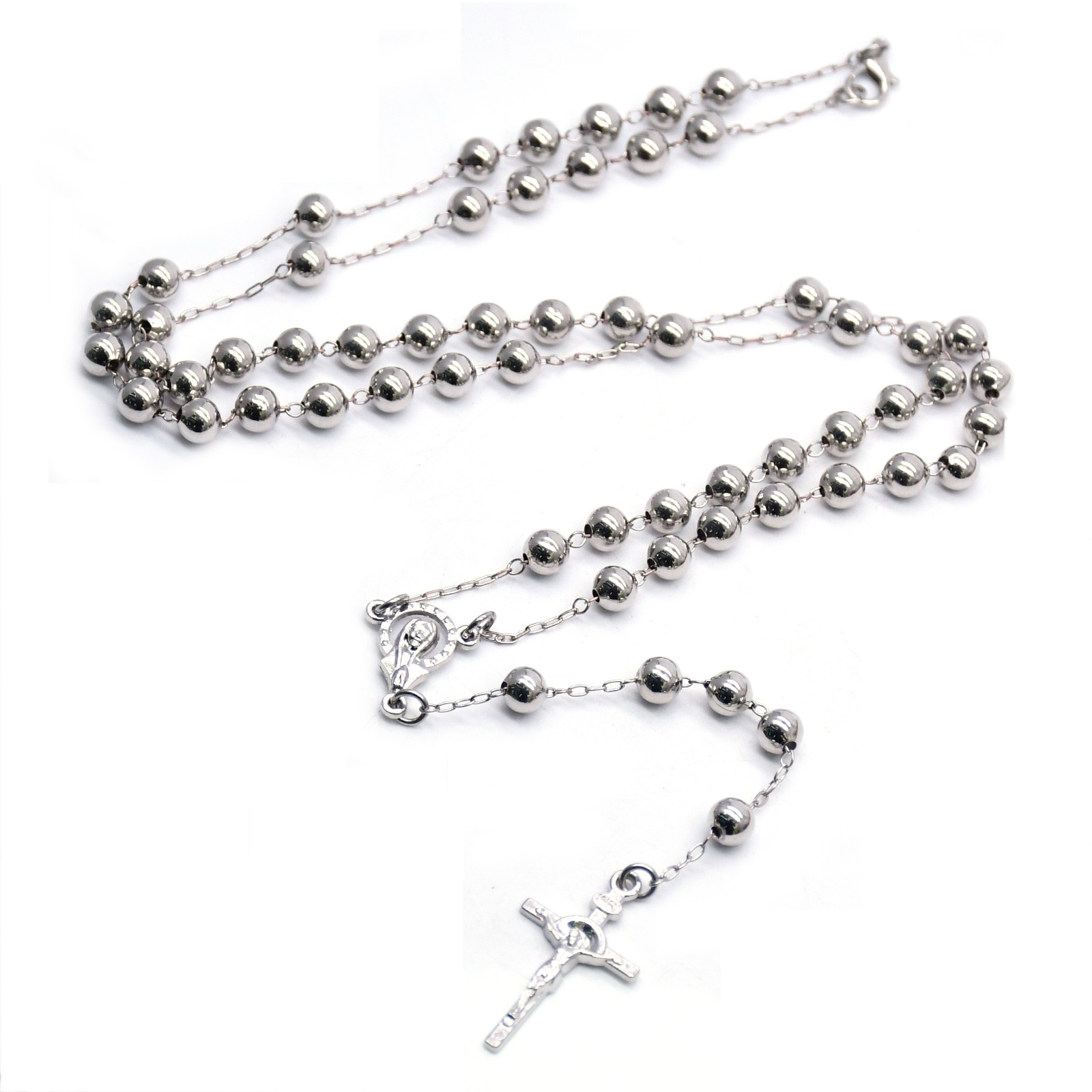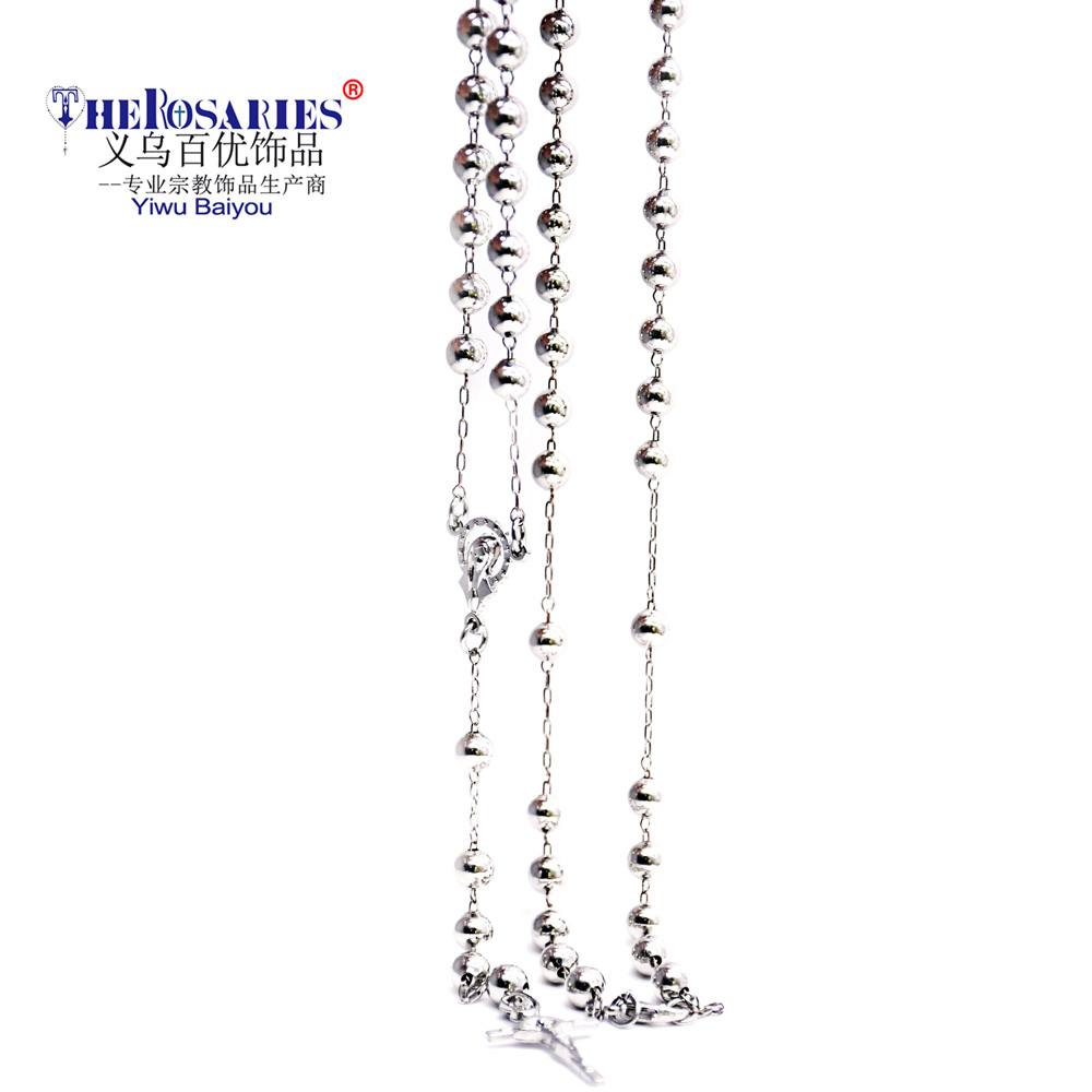 (白K銀)6mm銅珠念珠十字架項鏈祈禱珠十字架