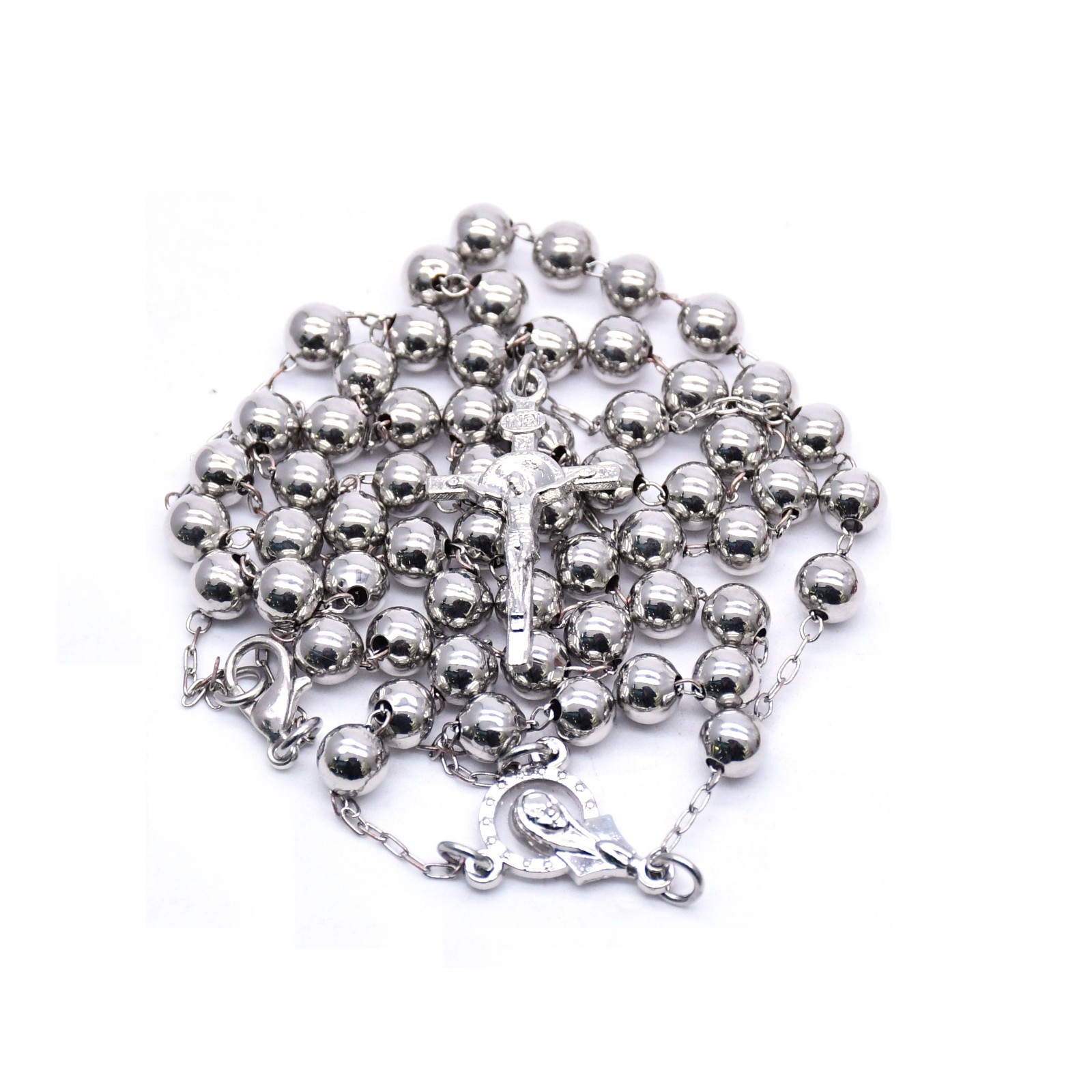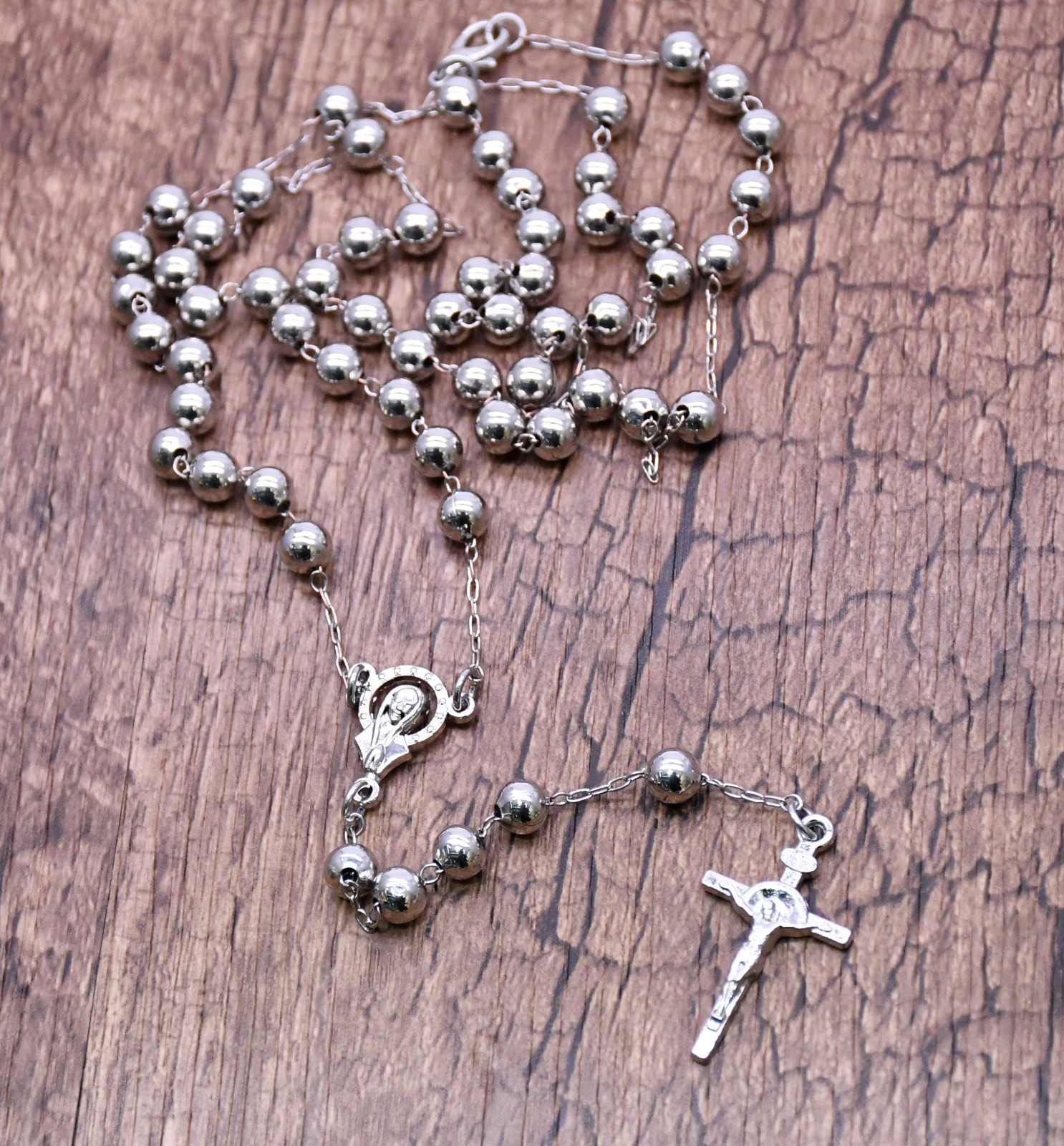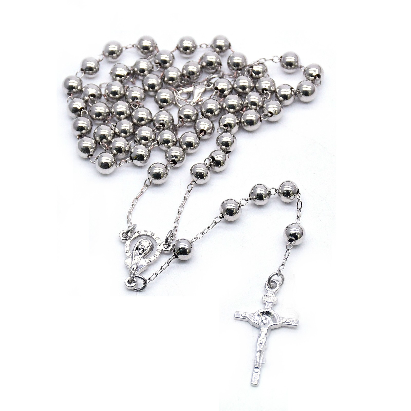 (白K銀)6mm銅珠念珠十字架項鏈祈禱珠十字架