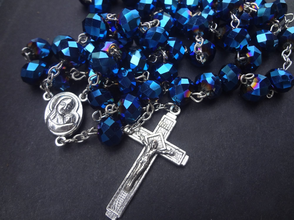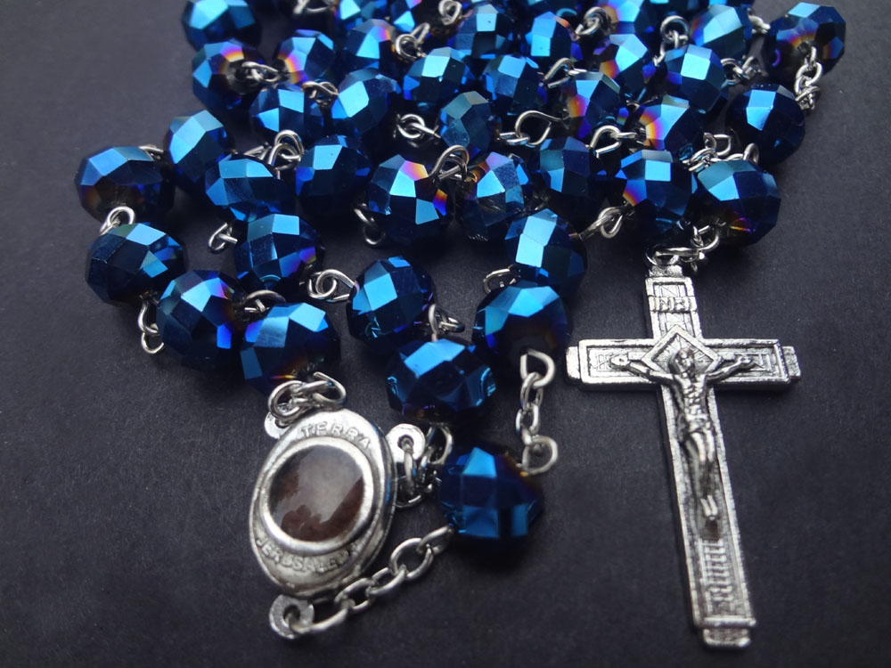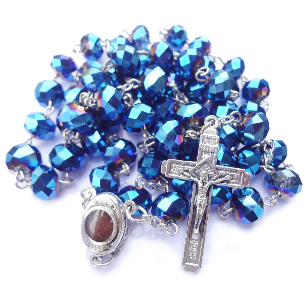 電商外貿(mào)產(chǎn)品8mm藍色水晶念珠十字架項鏈禮品批發(fā)