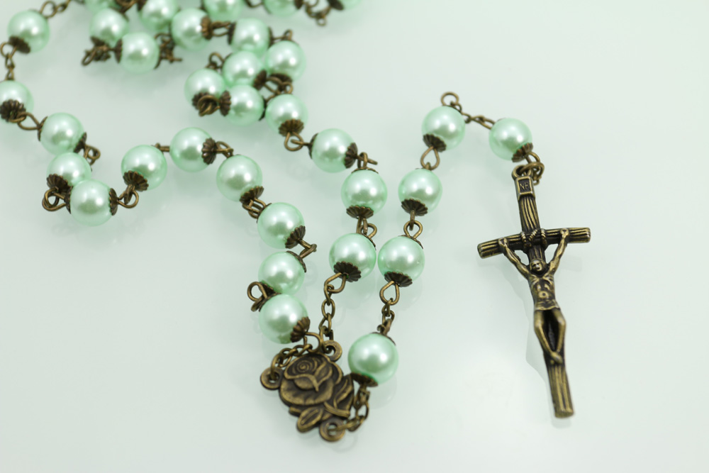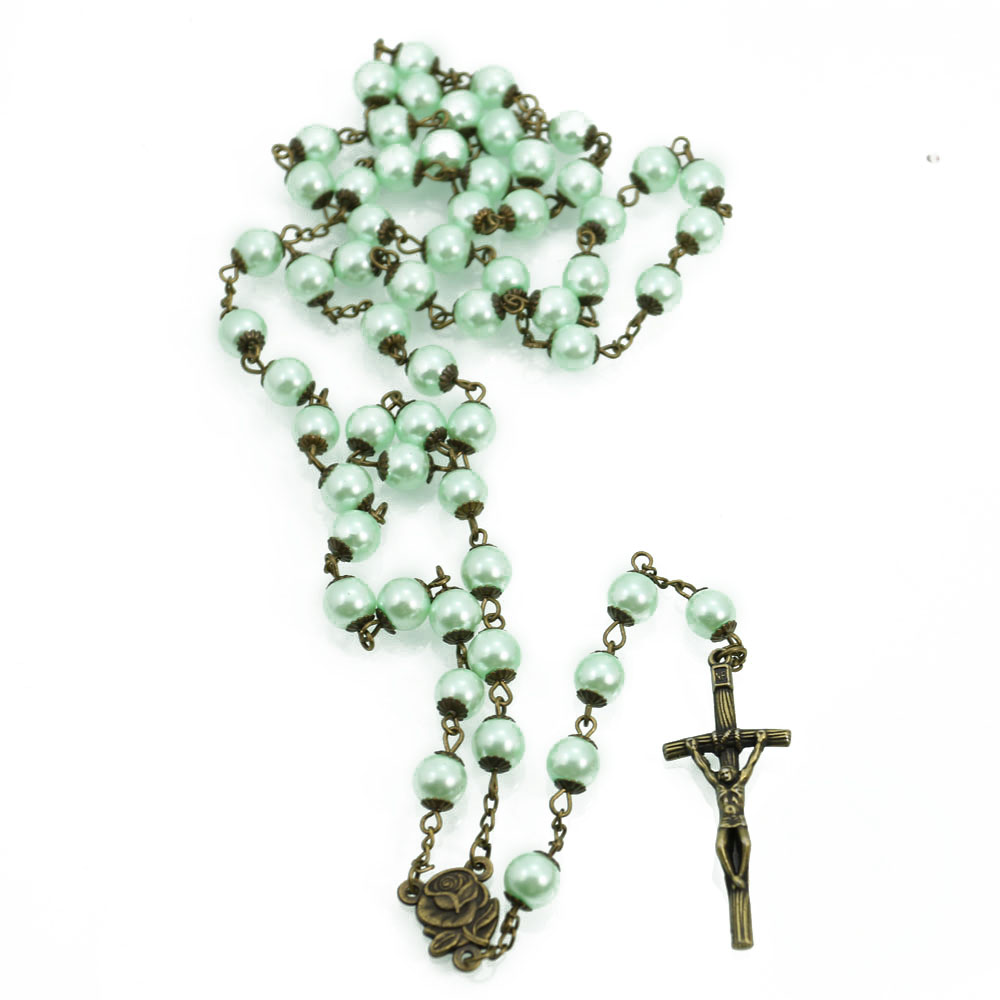 (綠色)Rosary念珠飾品項鏈仿陶瓷珠十字架項鏈祈禱珠