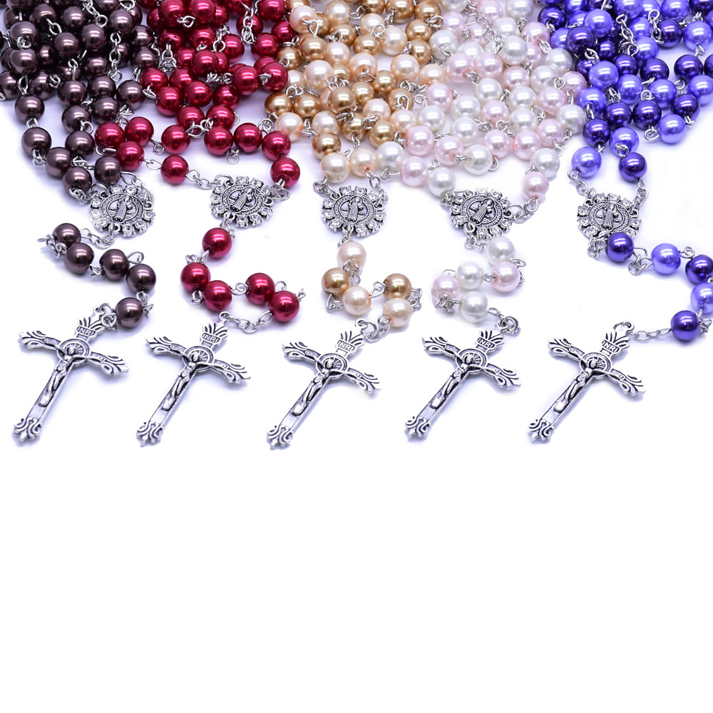 跨境十字架項鏈8mm金色珍珠念珠項鏈飾品十字架車掛用品