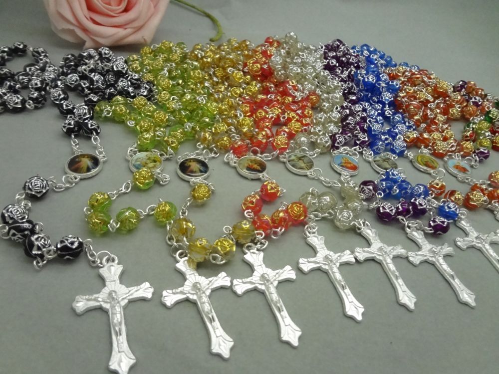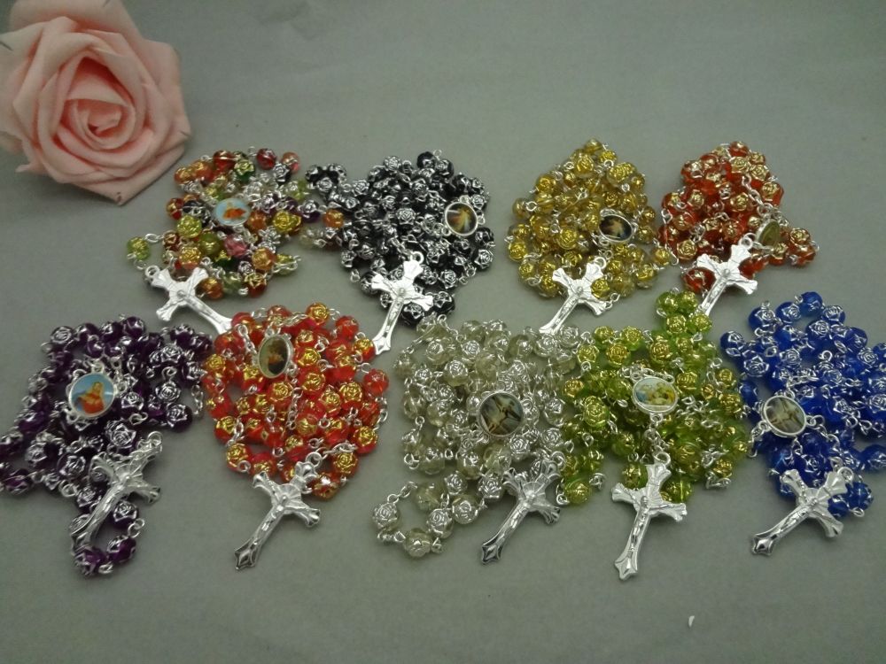念珠飾品批發(fā) 十字架項(xiàng)鏈塑料玫瑰珠項(xiàng)鏈