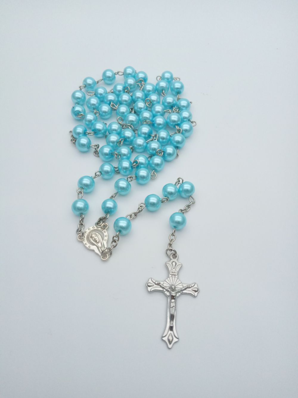 (藍色)6mm玫瑰花珍珠念珠項鏈十字架基督天主教飾品
