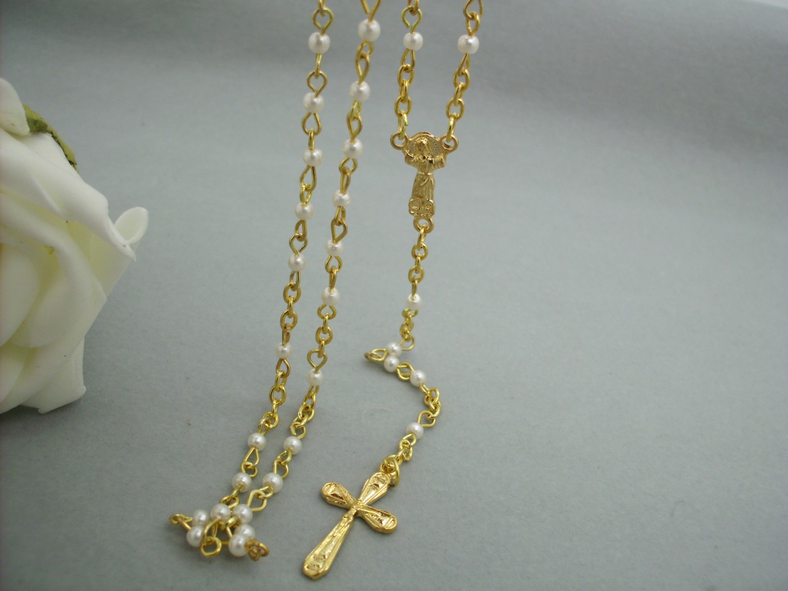 (白色)6mm玫瑰花珍珠十字架念珠項鏈59顆祈禱珠
