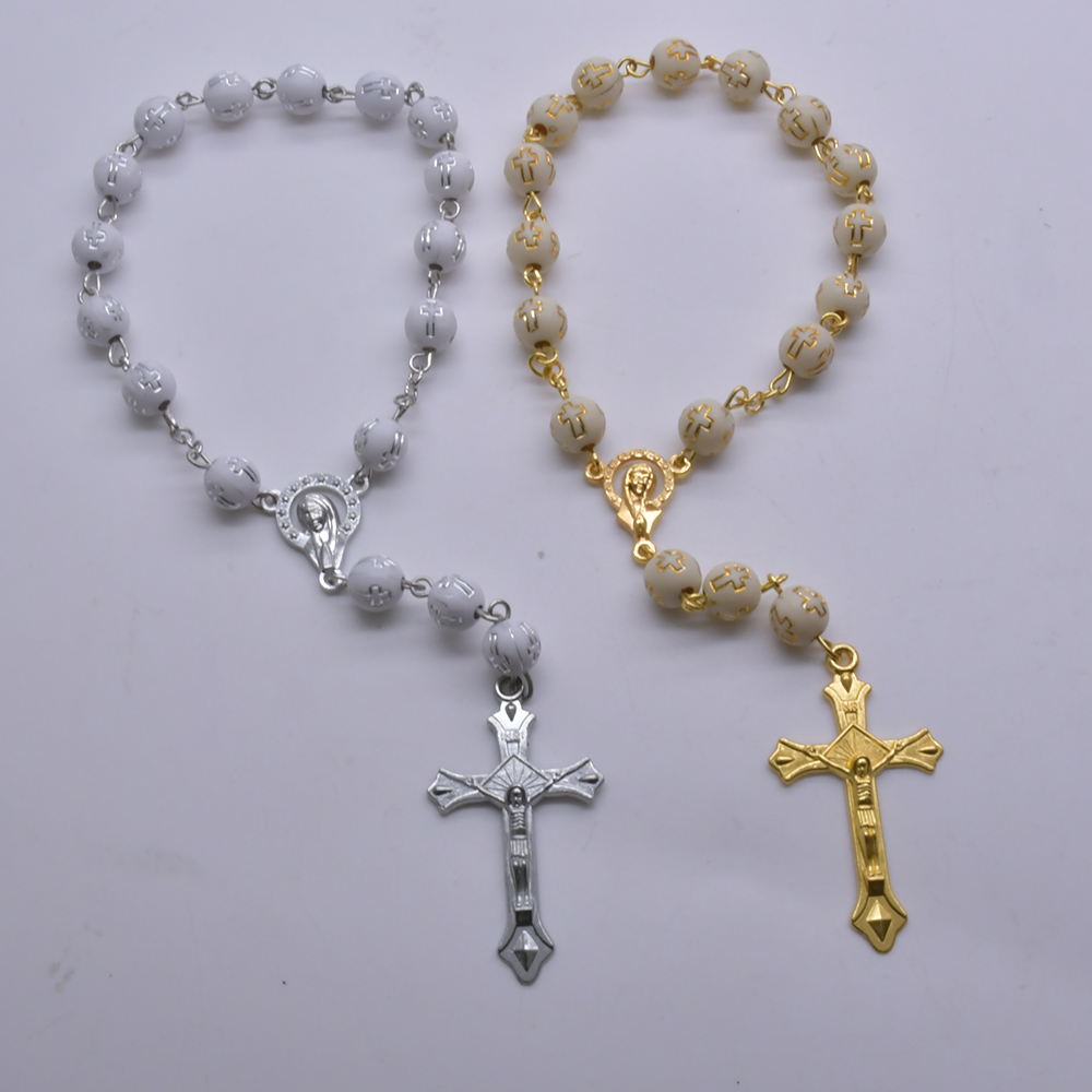 (銀色白K)車掛十字珠念珠洗禮珠十字架手鏈Rosary bracelet