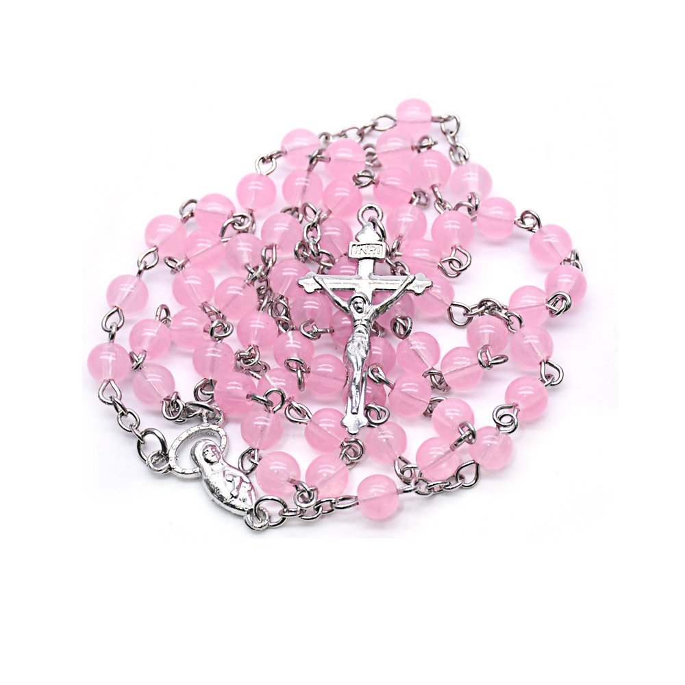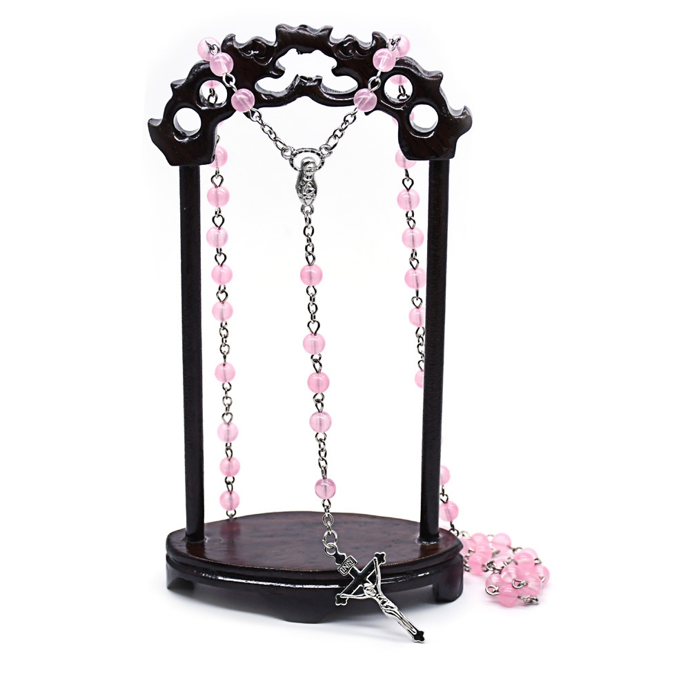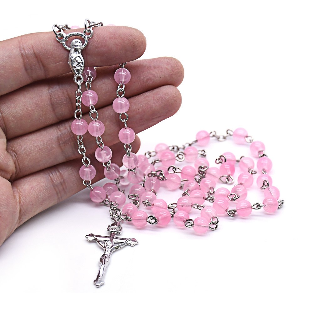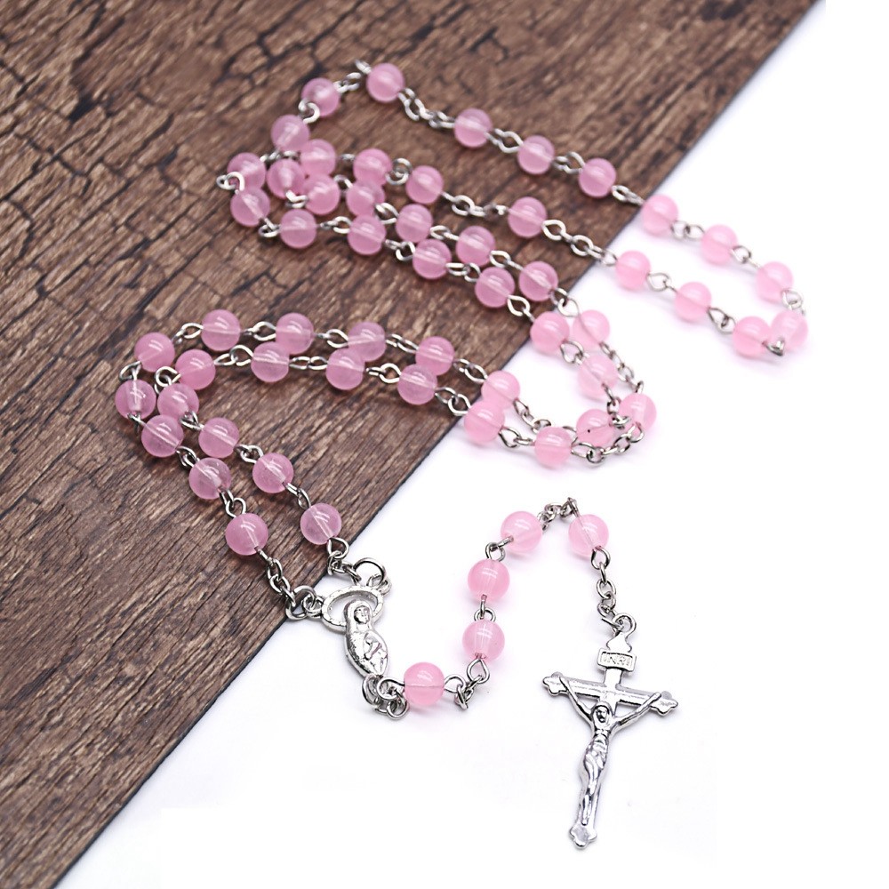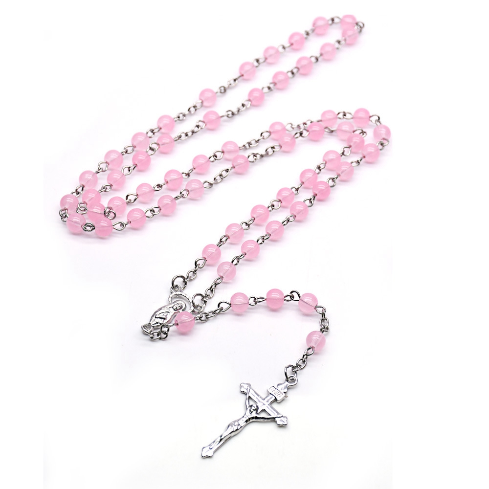 (粉)十字架項(xiàng)鏈 彎針珠鏈飾品6mm珠項(xiàng)鏈27g