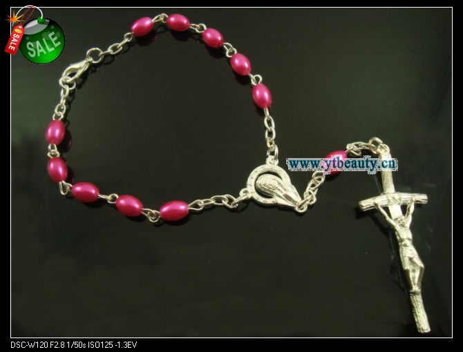 外貿(mào)跨境電商玫瑰十字架粉色念珠手鏈車掛