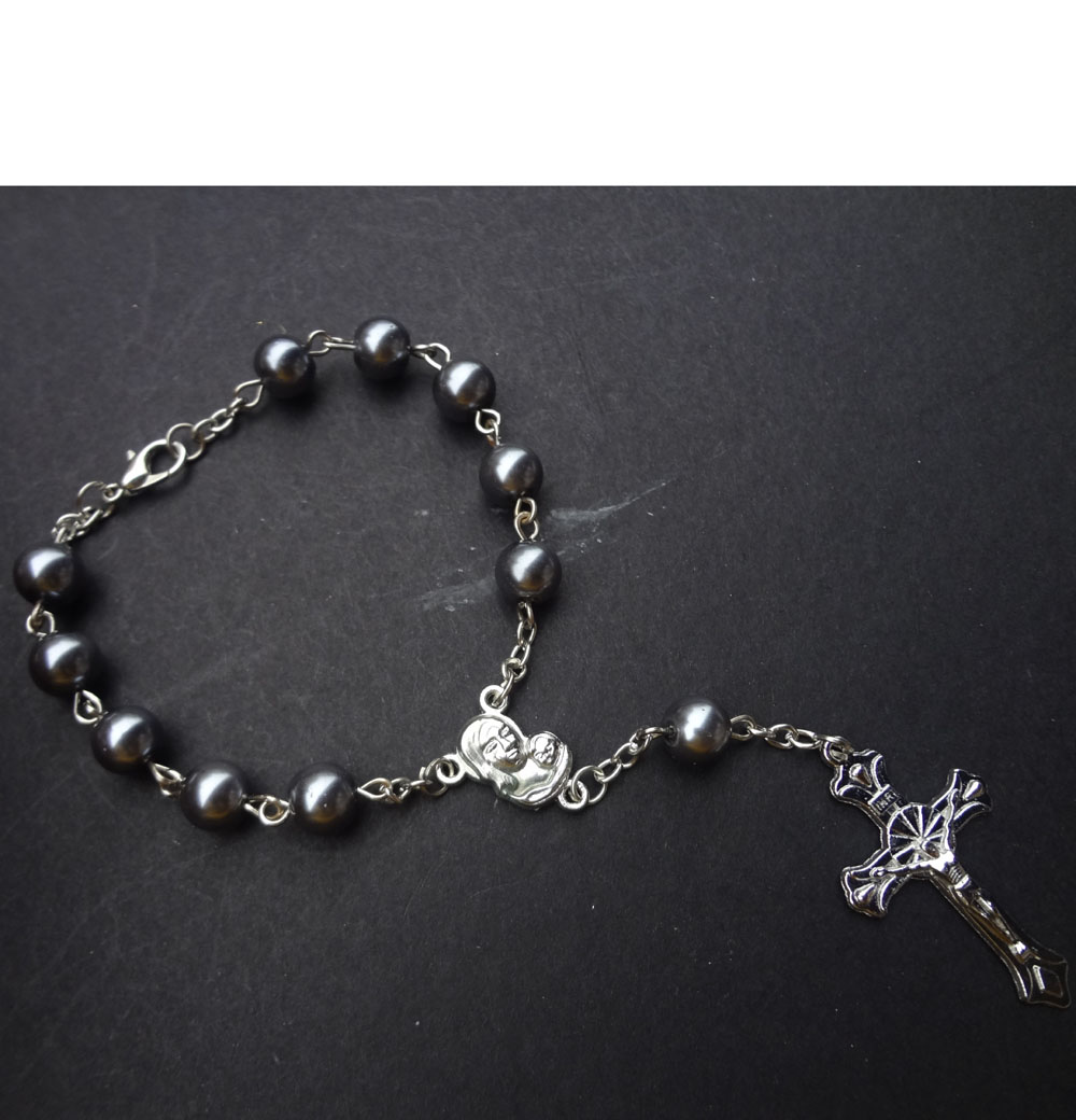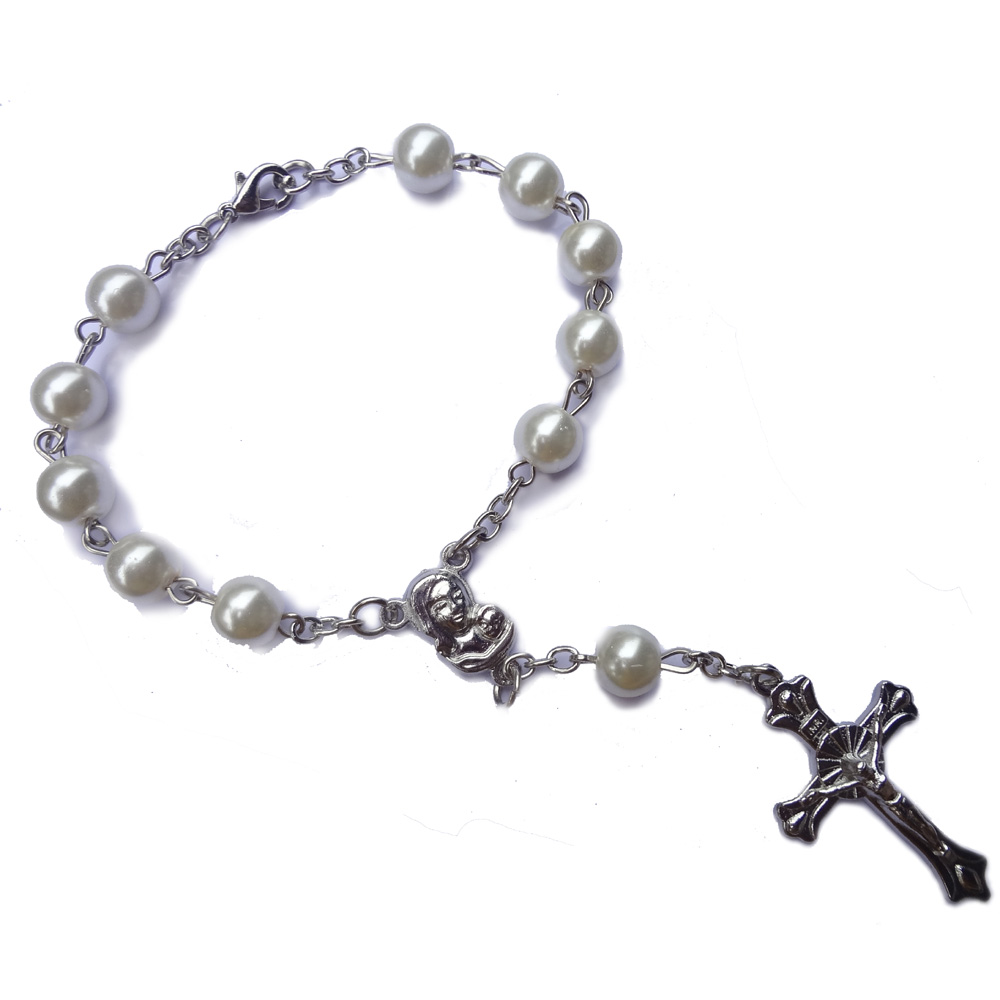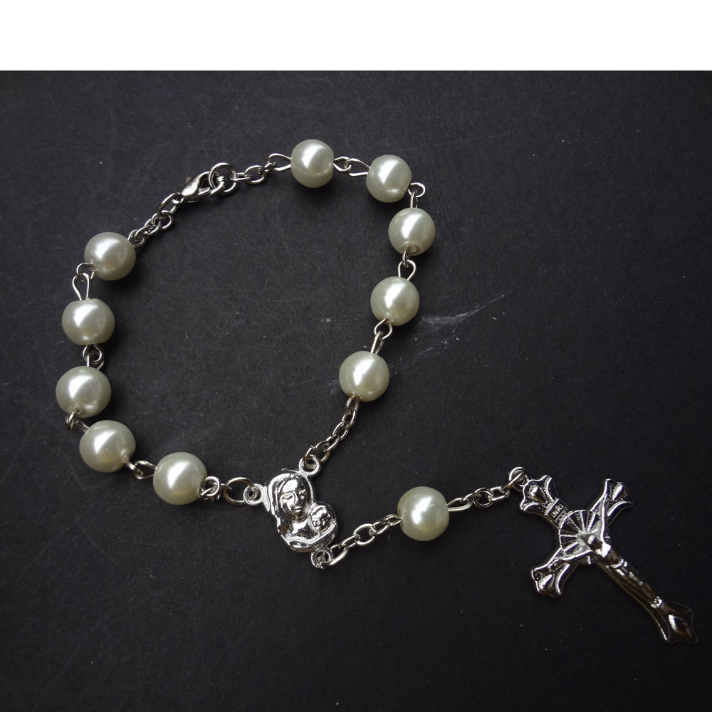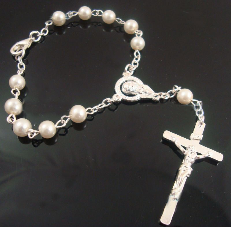 (銀色白K)車掛十字珠念珠洗禮珠十字架手鏈Rosary bracelet