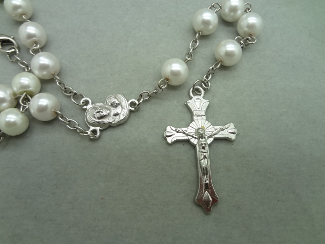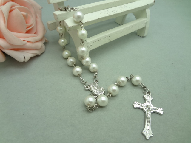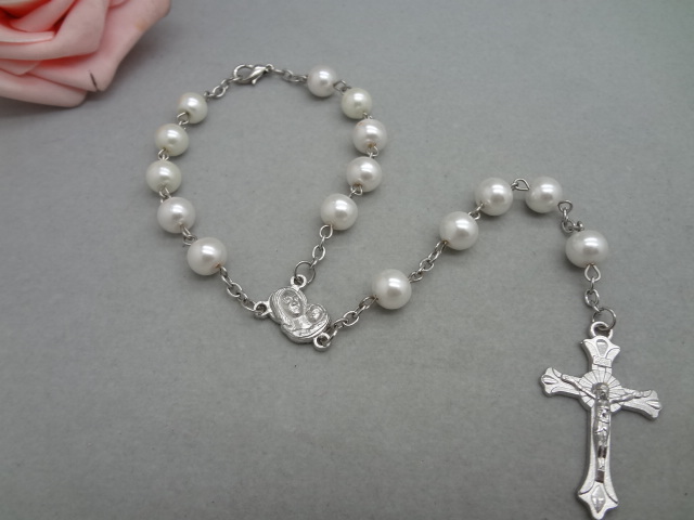 (銀色白K)車掛十字珠念珠洗禮珠十字架手鏈Rosary bracelet