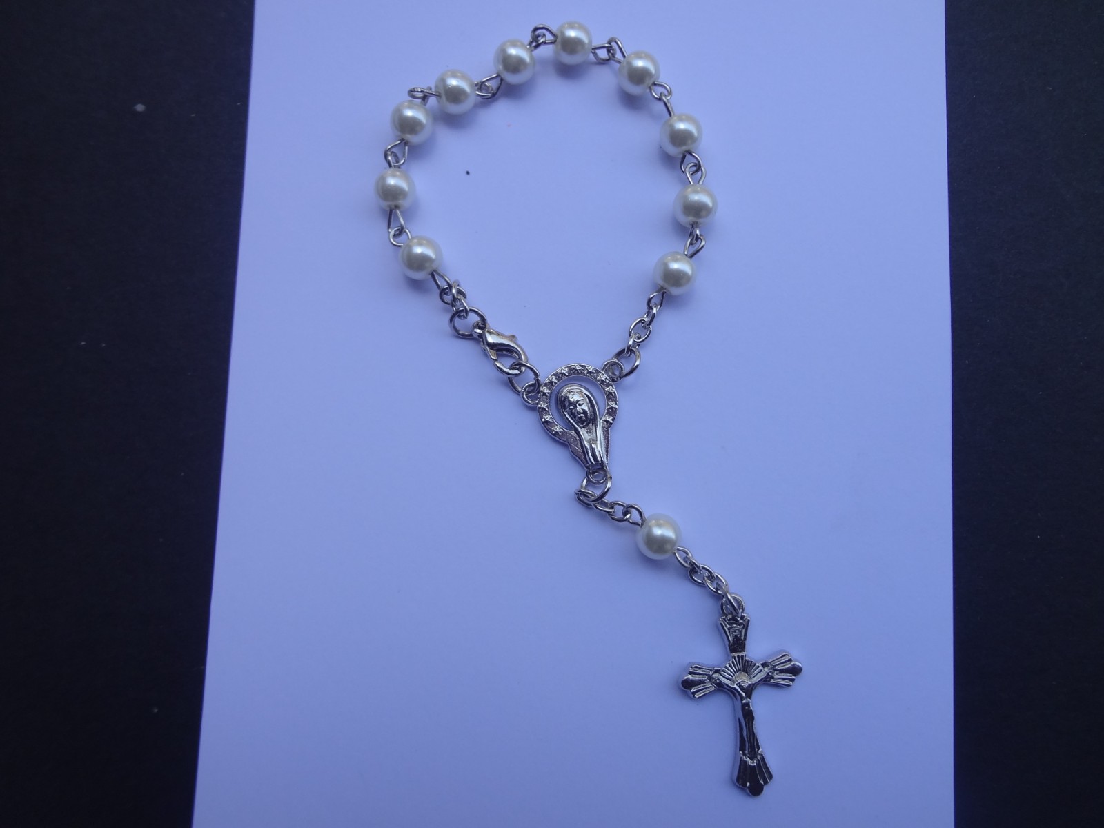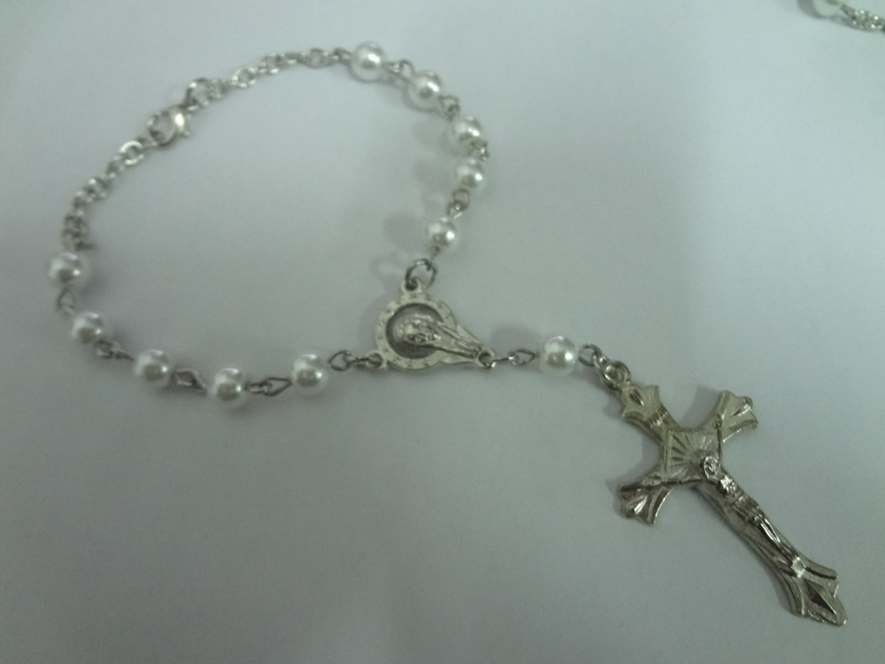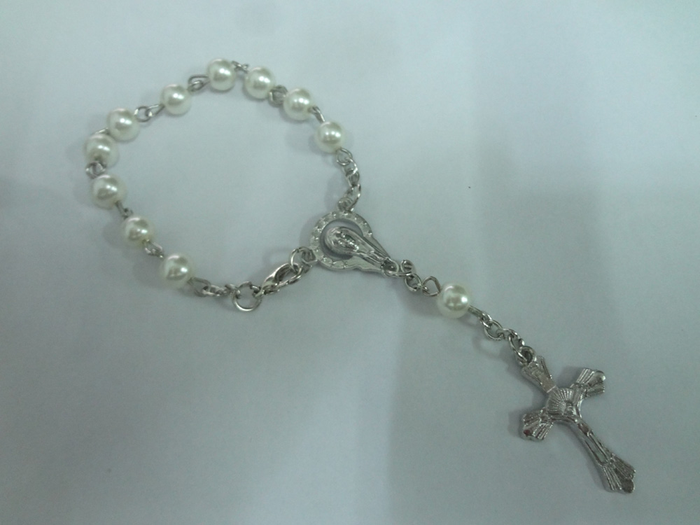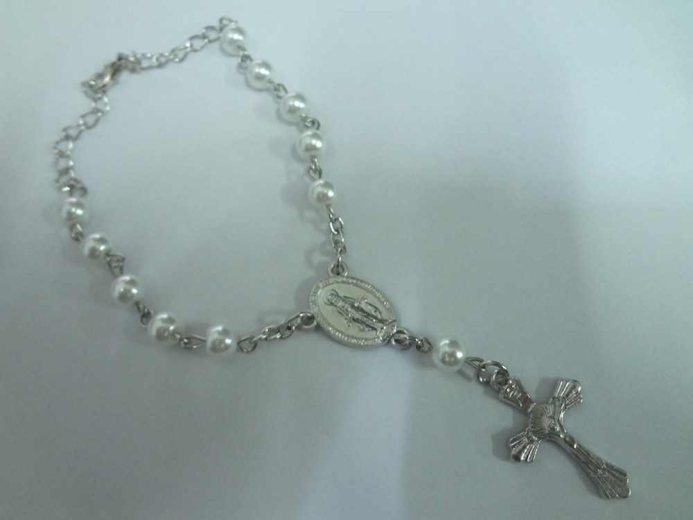 (銀色白K)車掛十字珠念珠洗禮珠十字架手鏈Rosary bracelet