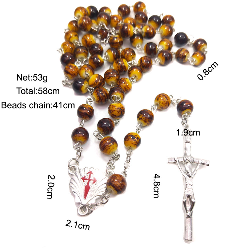 (咖色)Rosary念珠飾品項鏈仿陶瓷珠十字架項鏈
