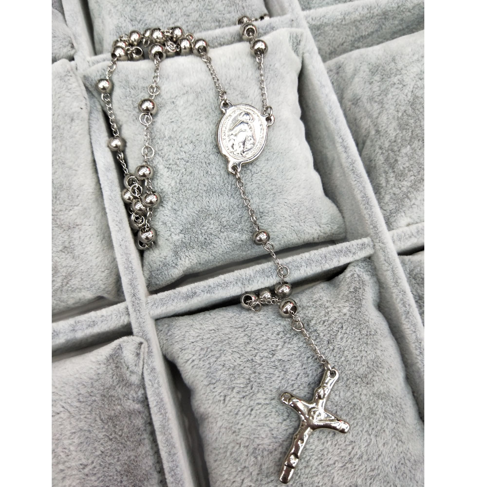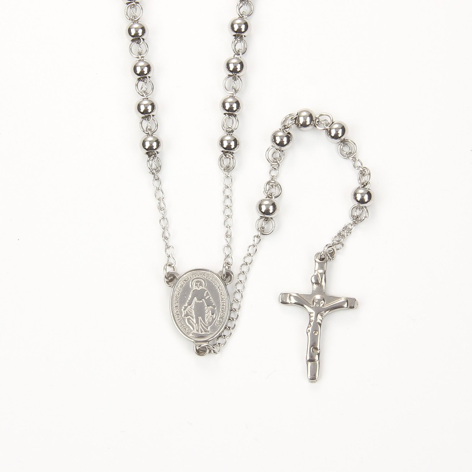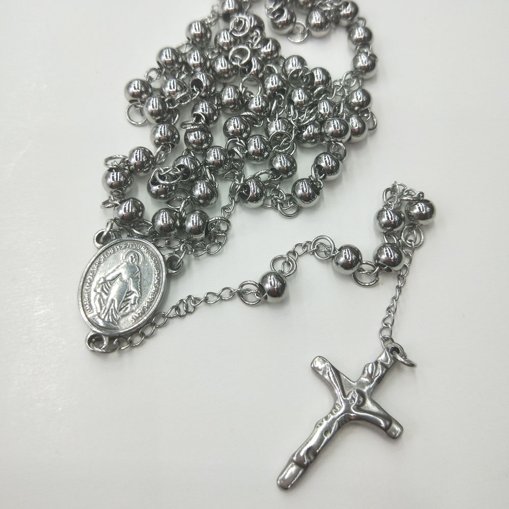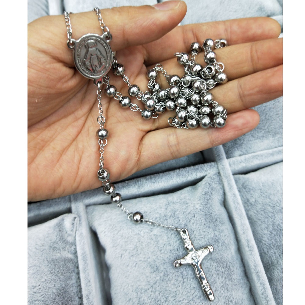 (白K銀)6mm銅珠念珠十字架項鏈祈禱珠十字架