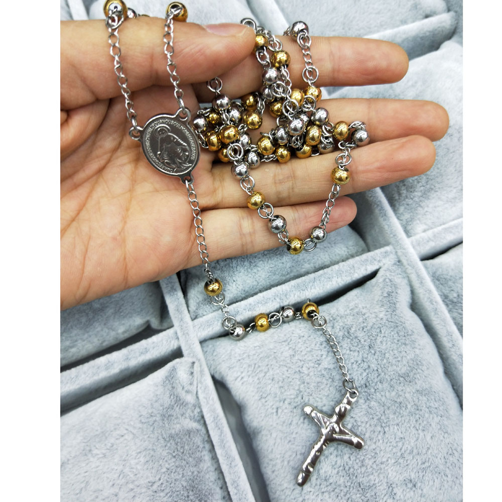 金銀雙色6mm銅珠念珠十字架項鏈祈禱珠跨境電商十字架用品批發(fā)