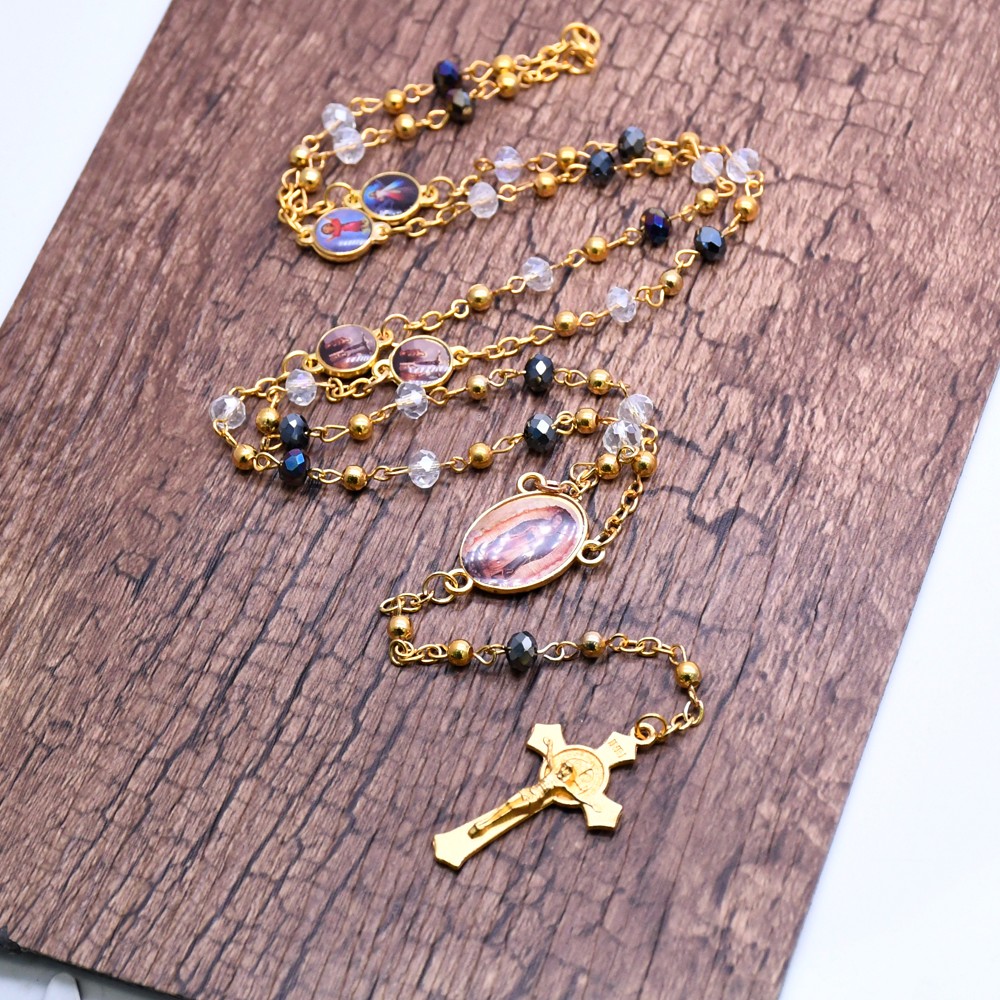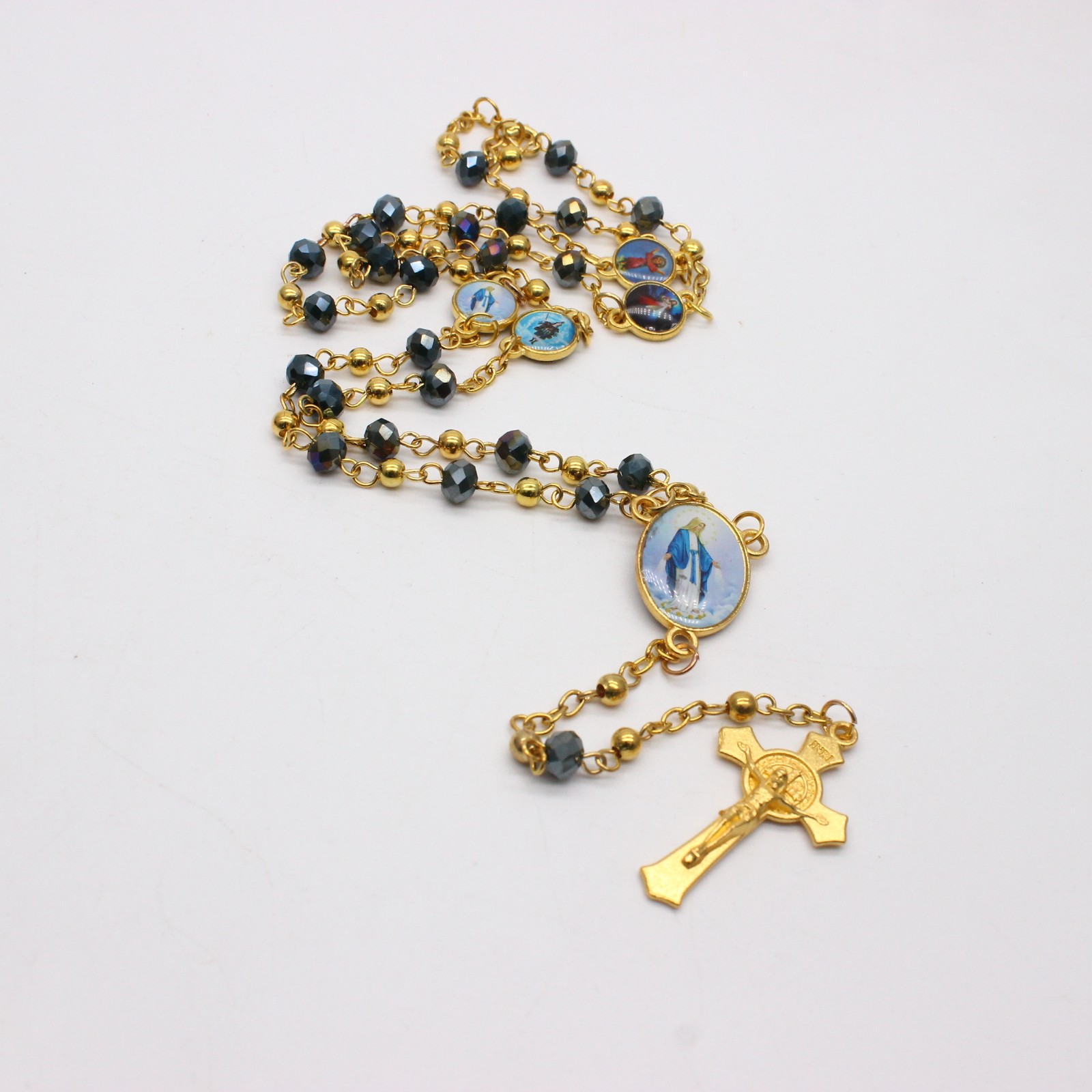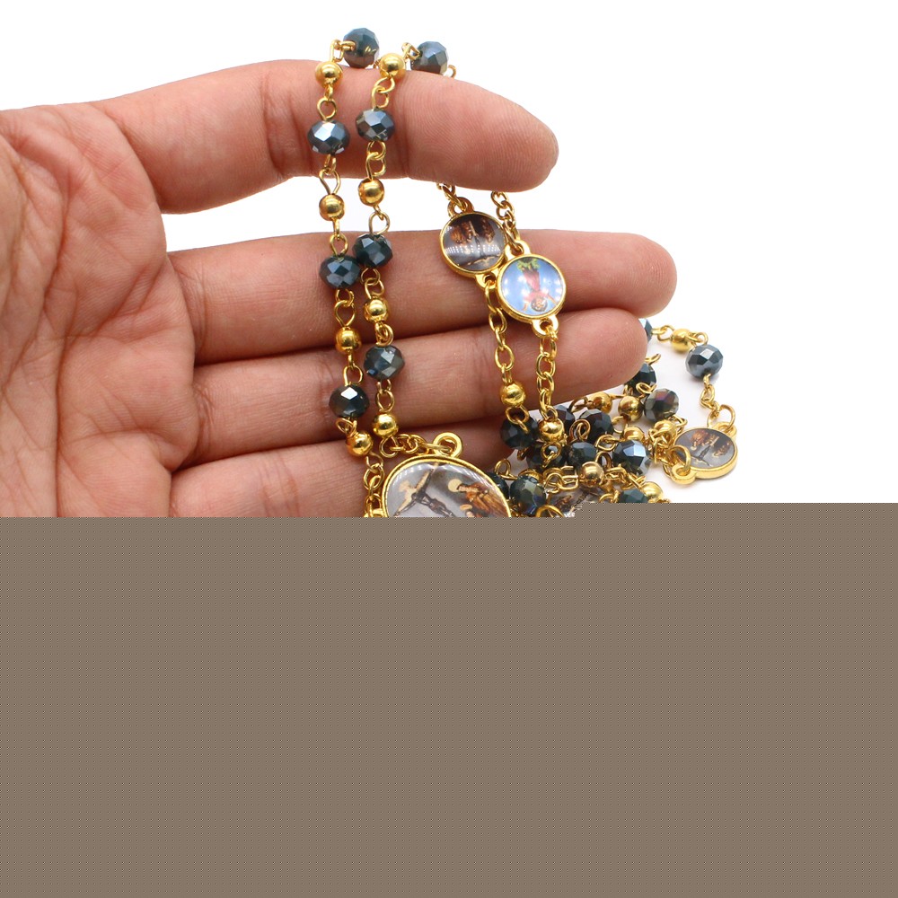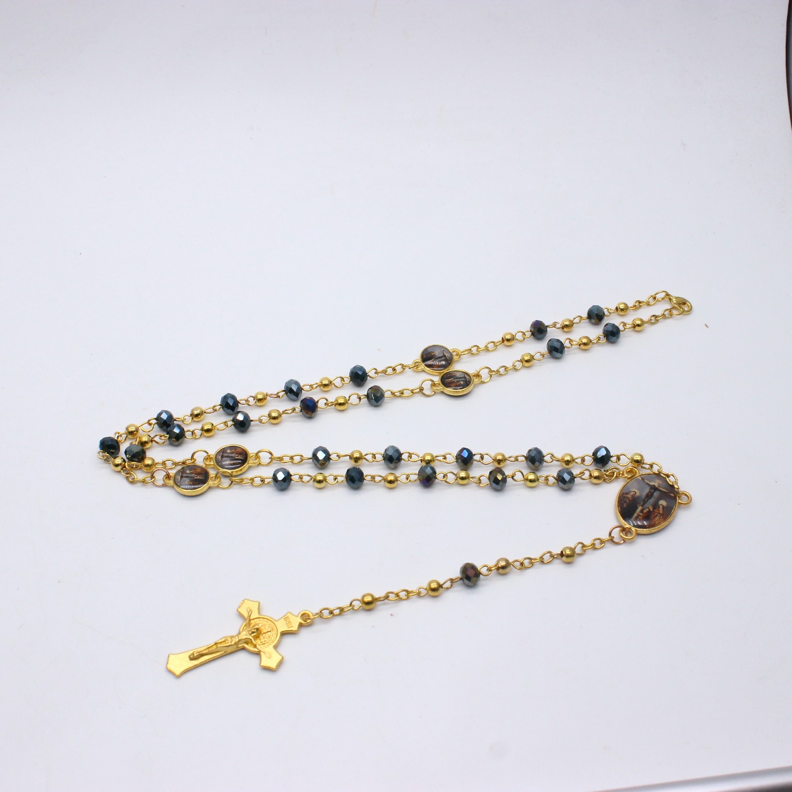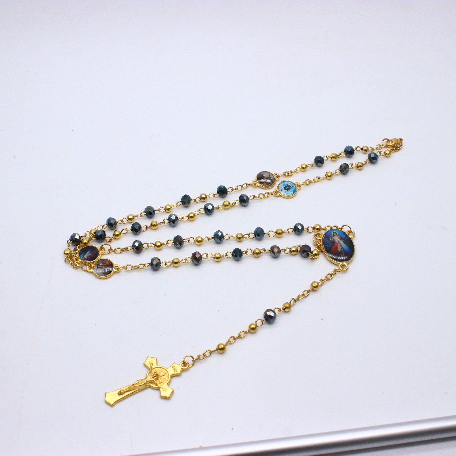 (黑色)四圣像貼圖金屬珠水晶念珠十字架項鏈(圖片隨機)
