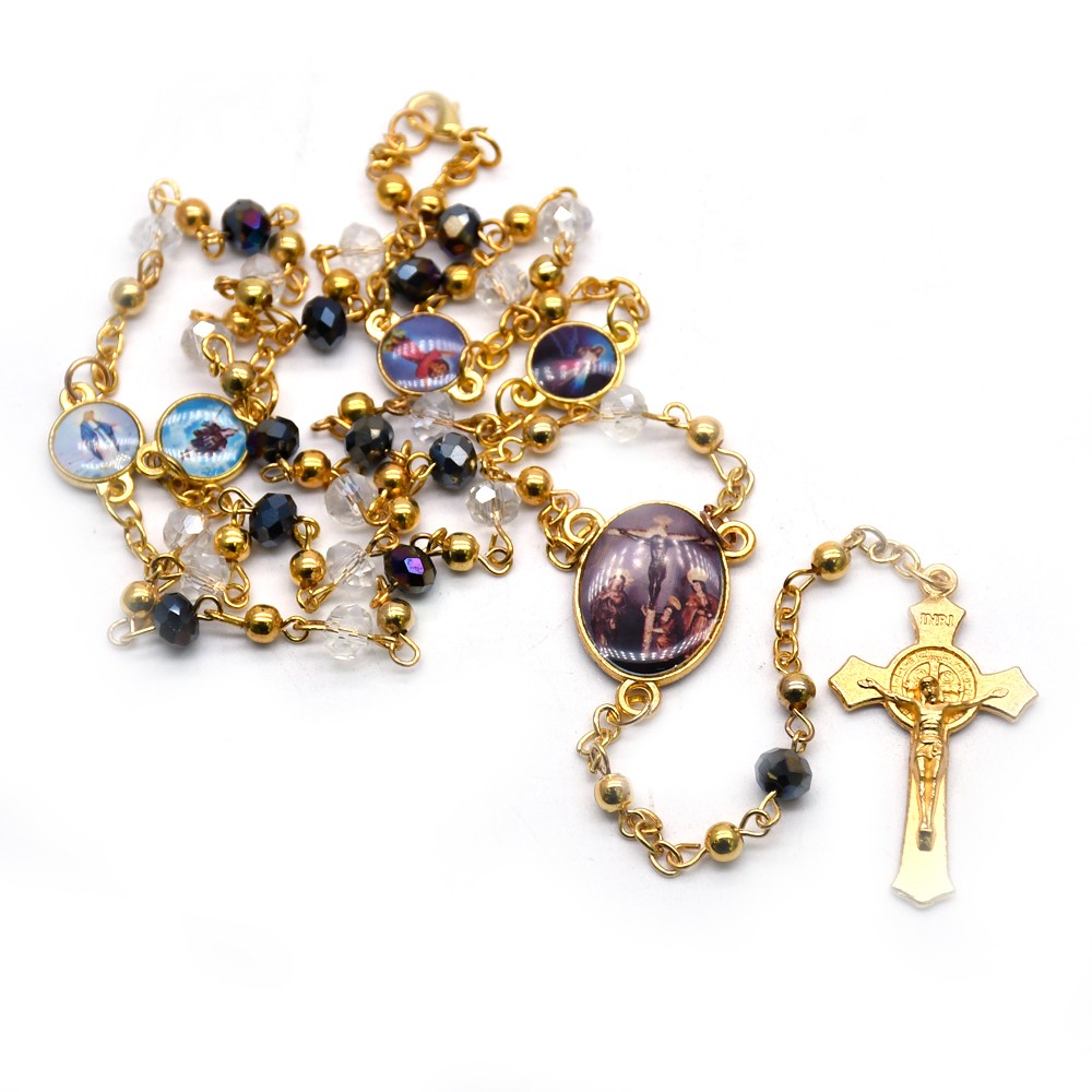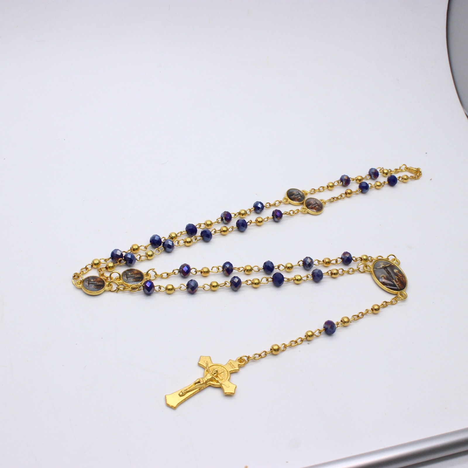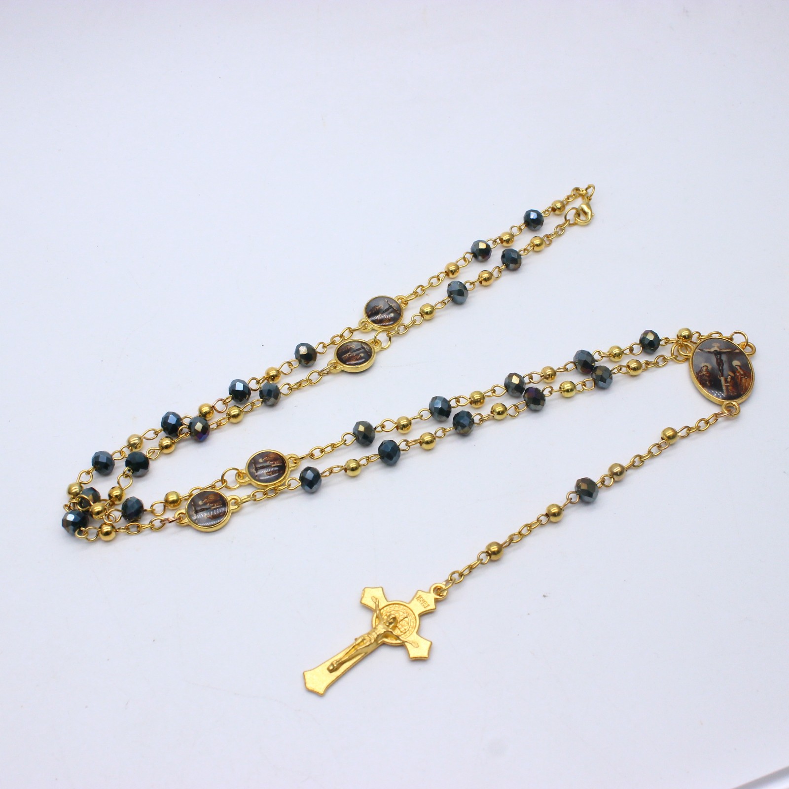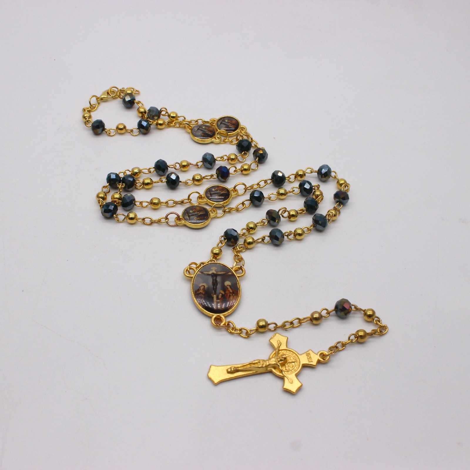 (黑色)四圣像貼圖金屬珠水晶念珠十字架項鏈(圖片隨機)