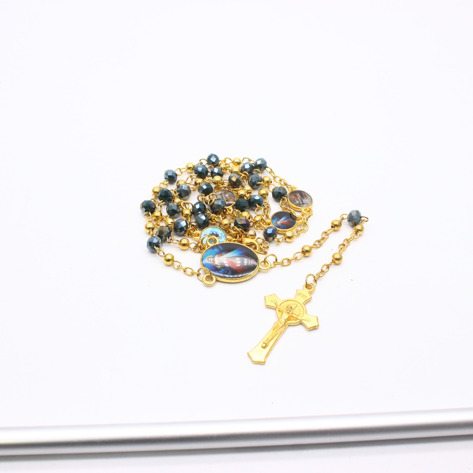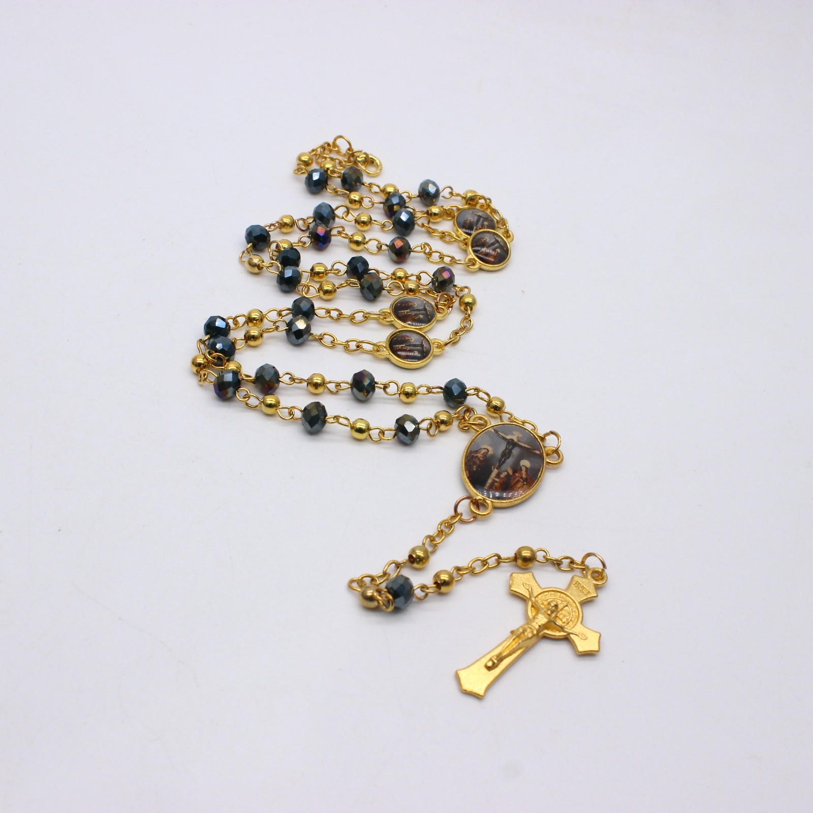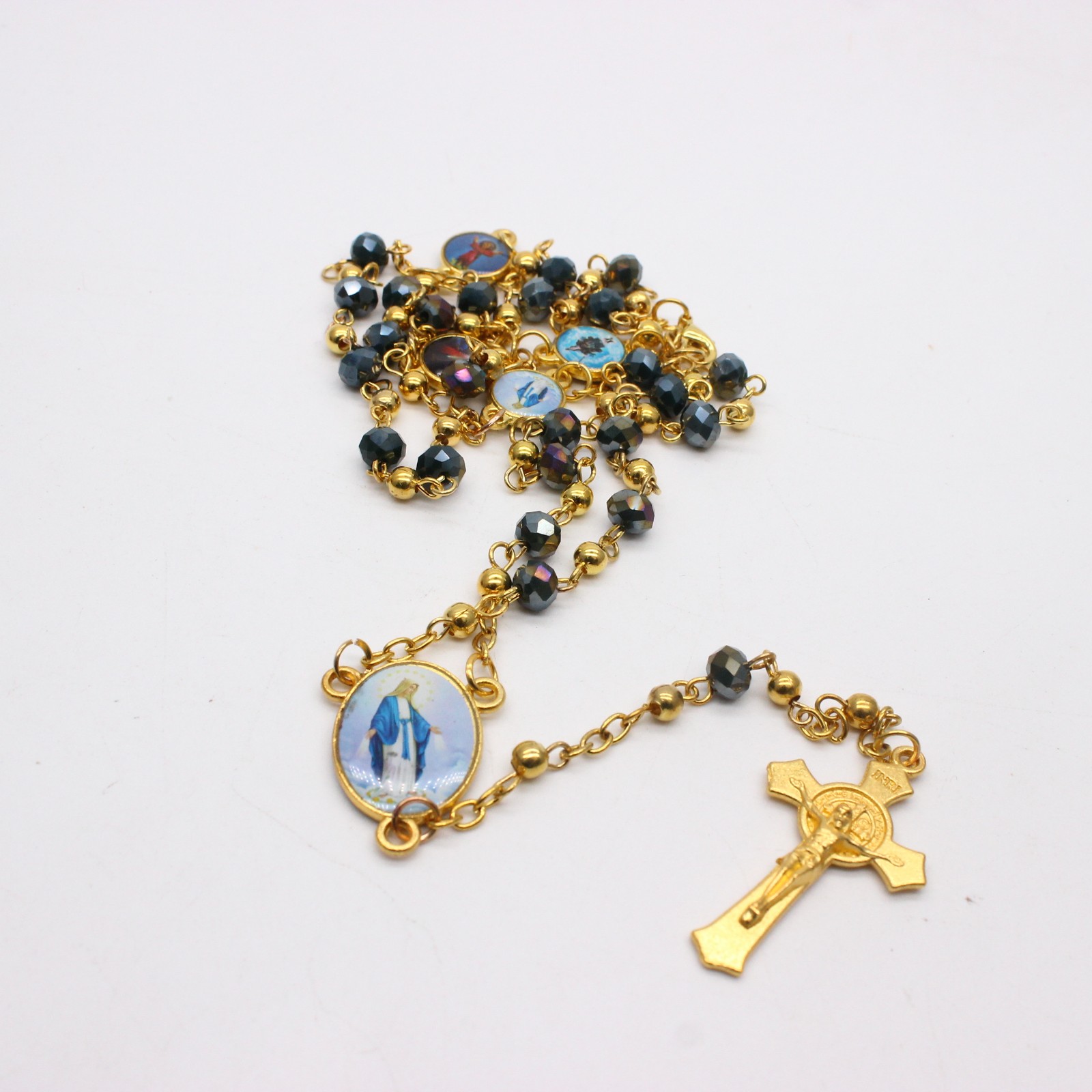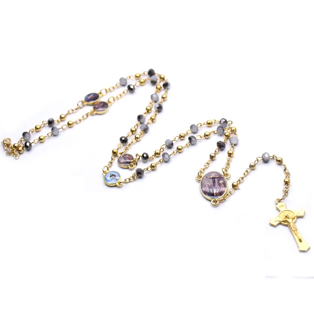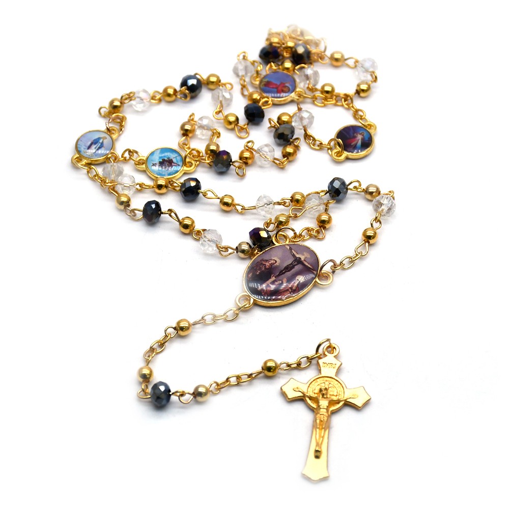 (黑色)四圣像貼圖金屬珠水晶念珠十字架項鏈(圖片隨機)