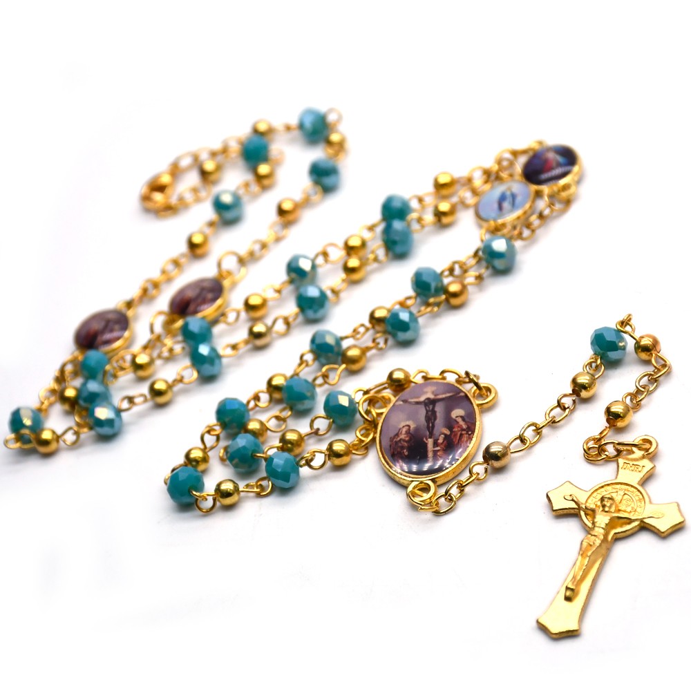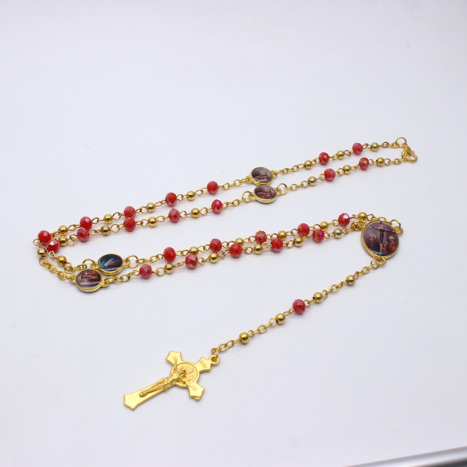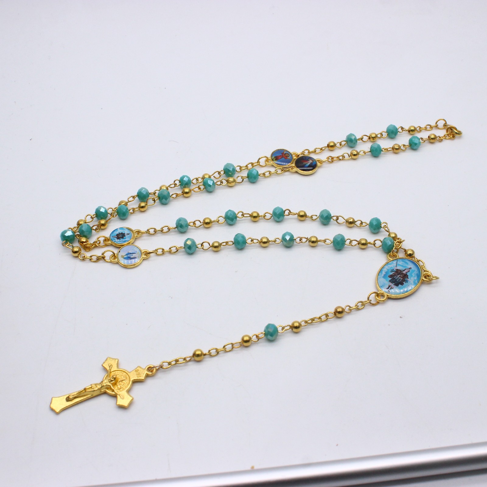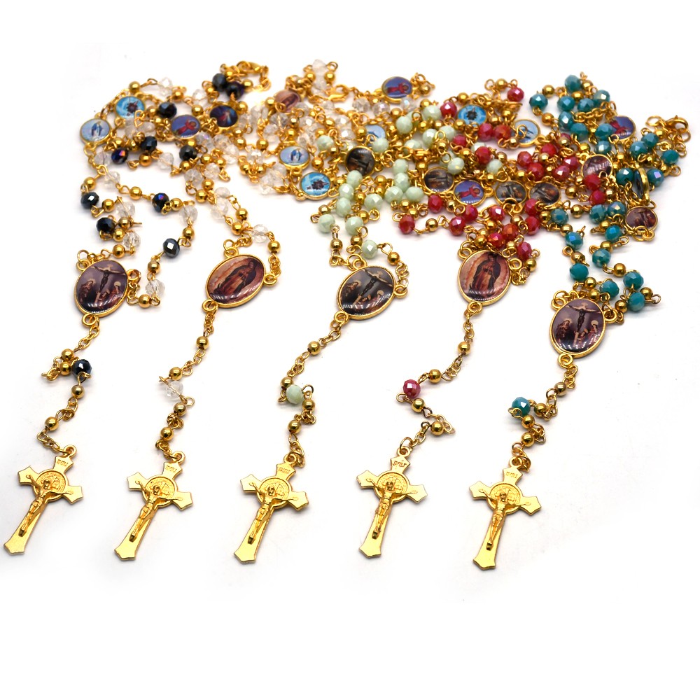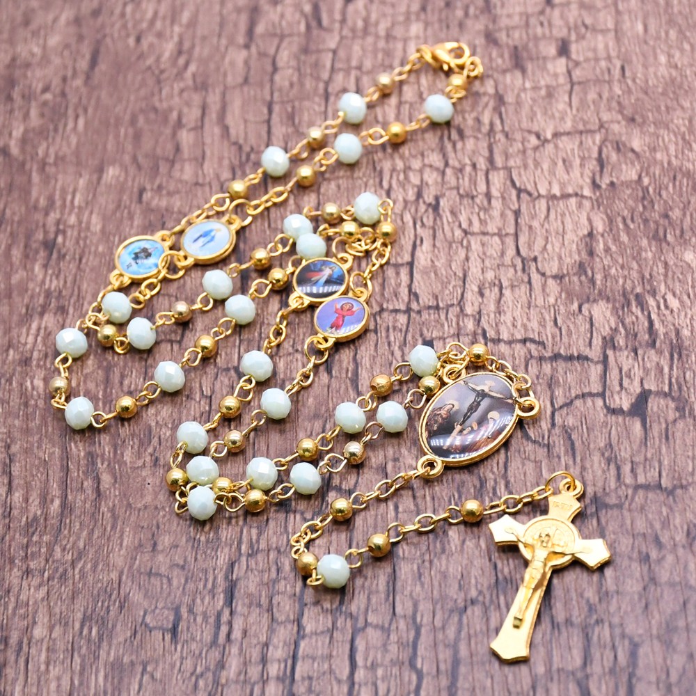 (黑色)四圣像貼圖金屬珠水晶念珠十字架項鏈(圖片隨機)