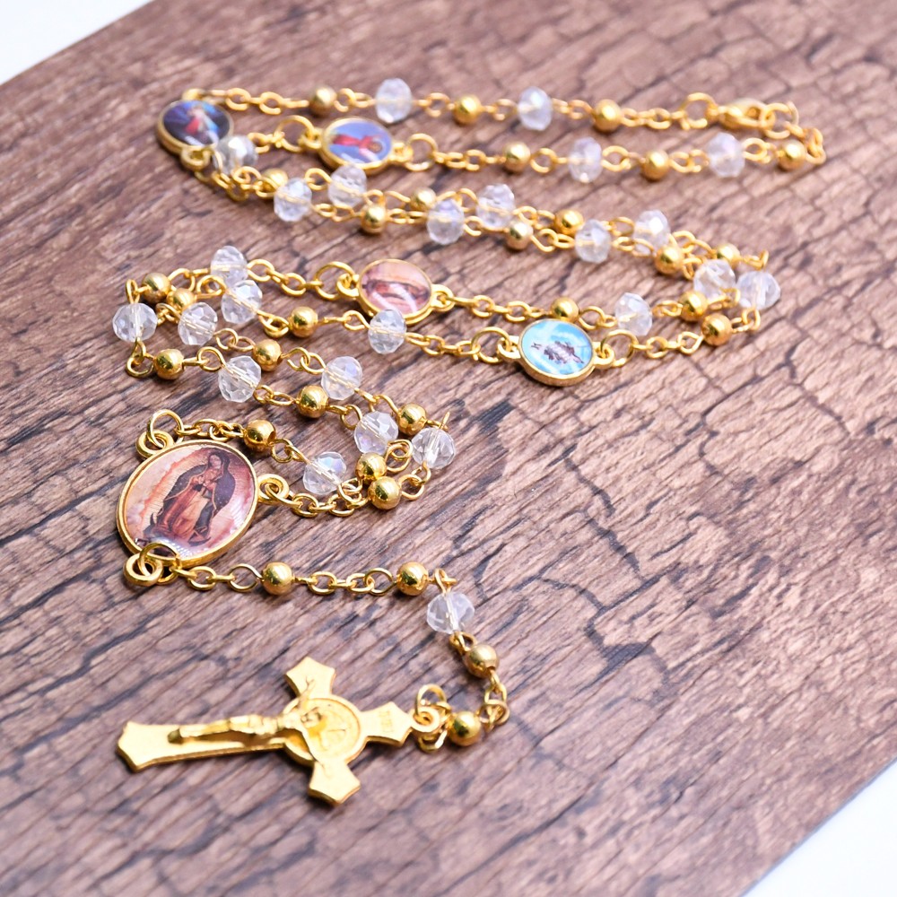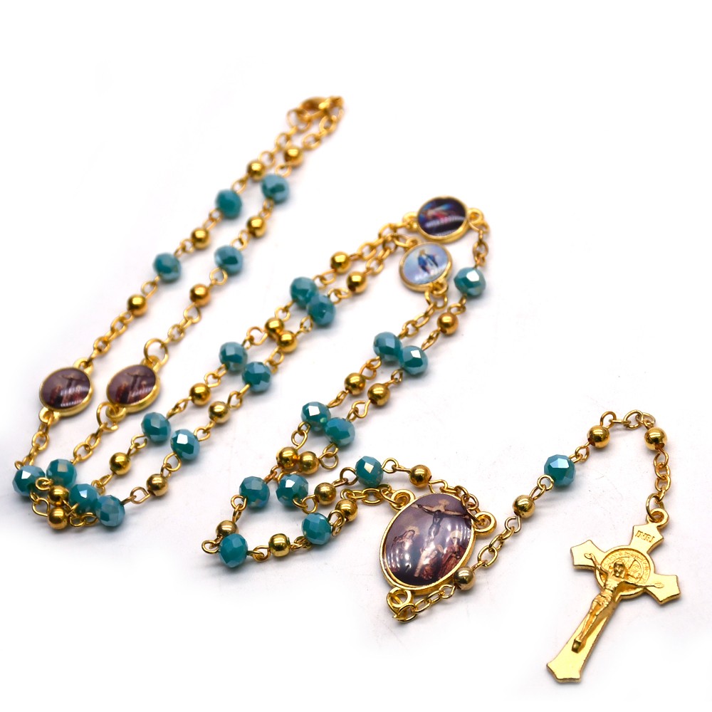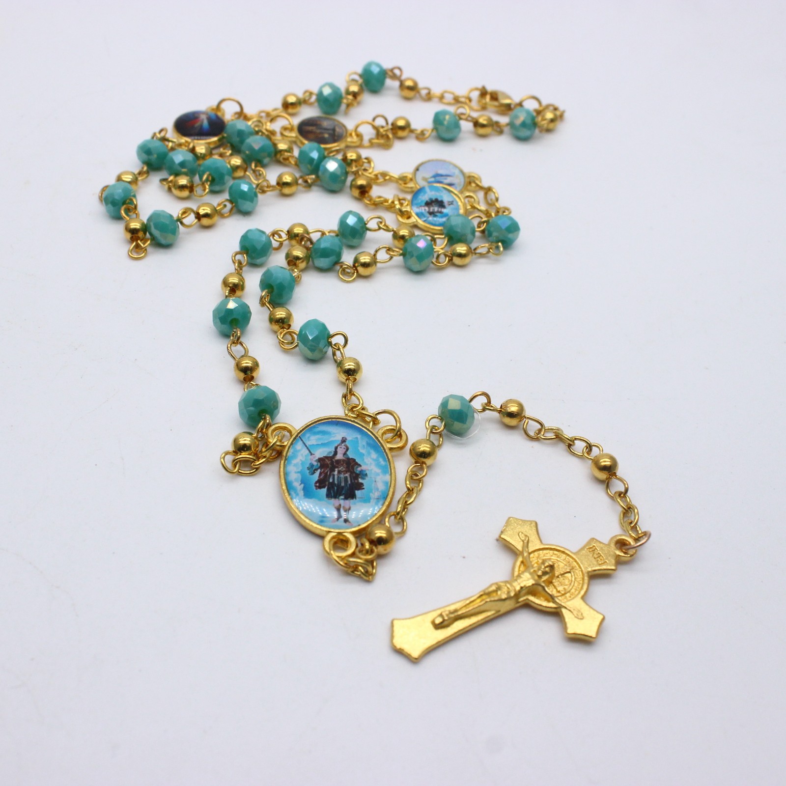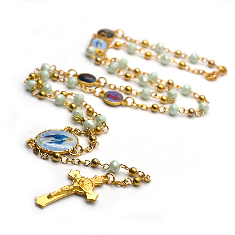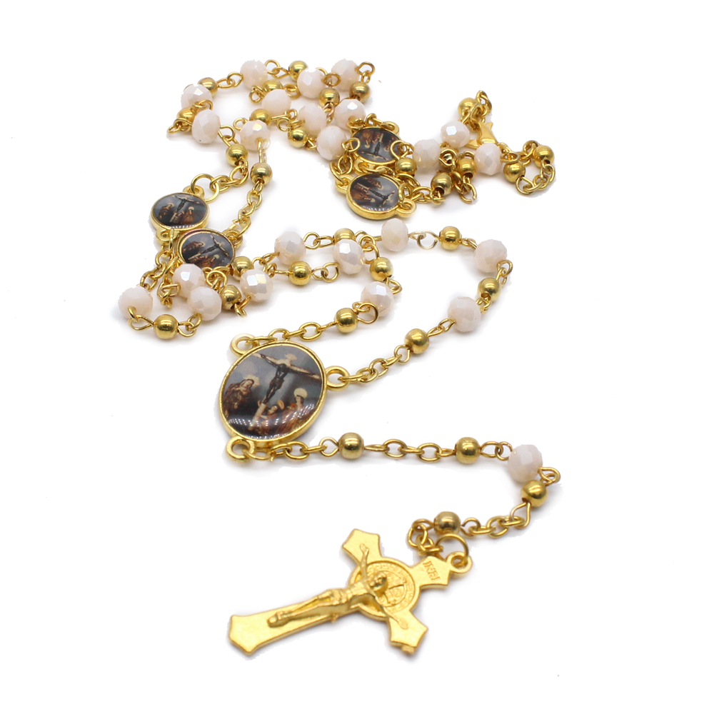 (黑色)四圣像貼圖金屬珠水晶念珠十字架項鏈(圖片隨機)