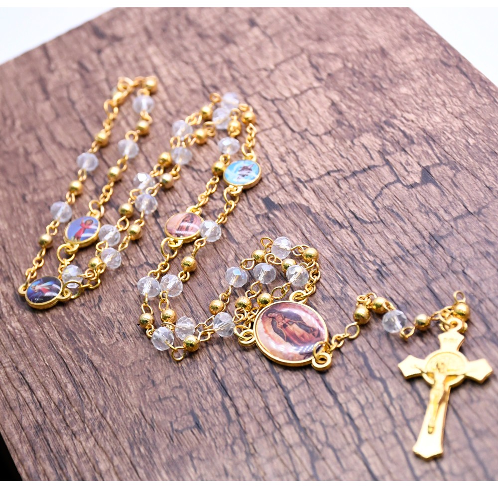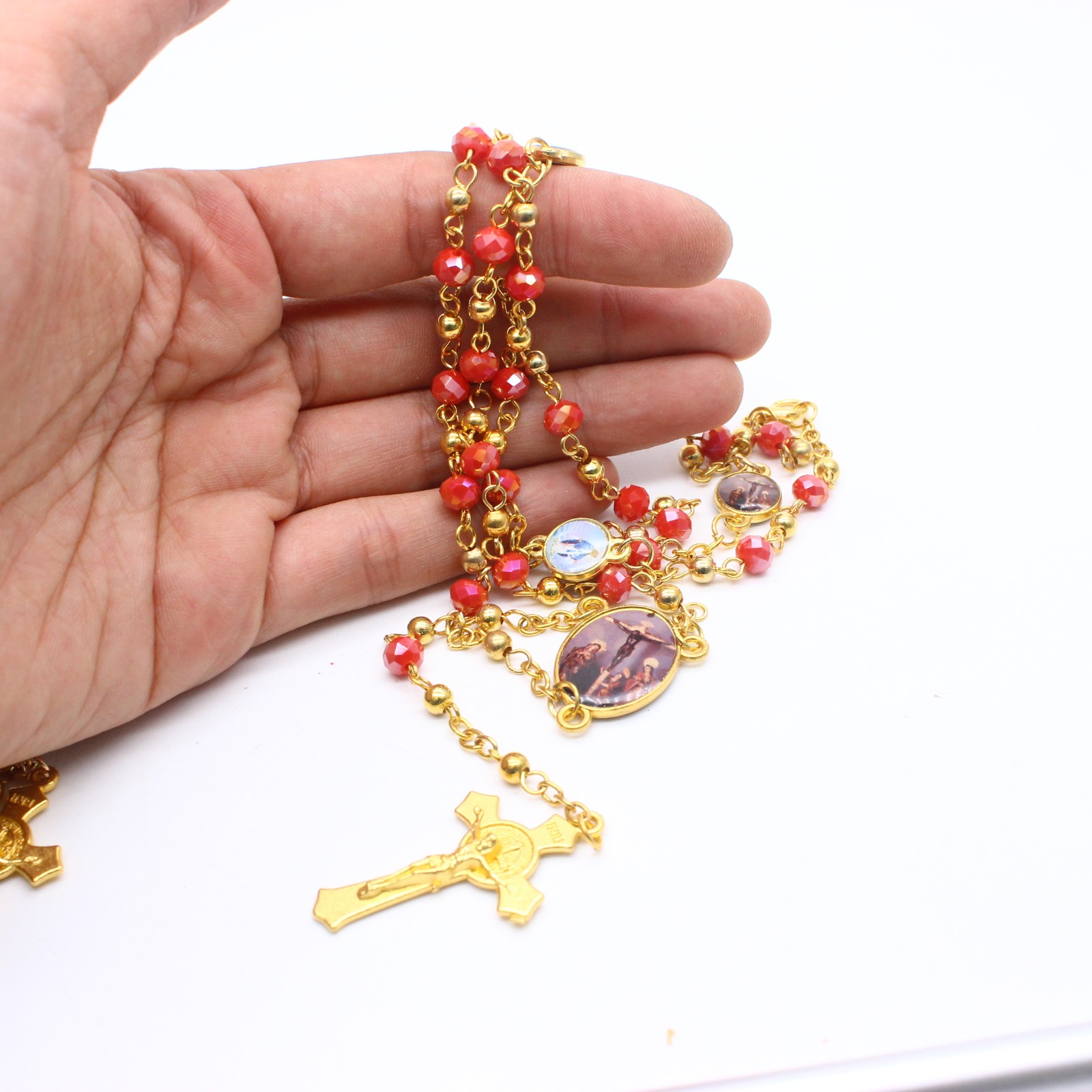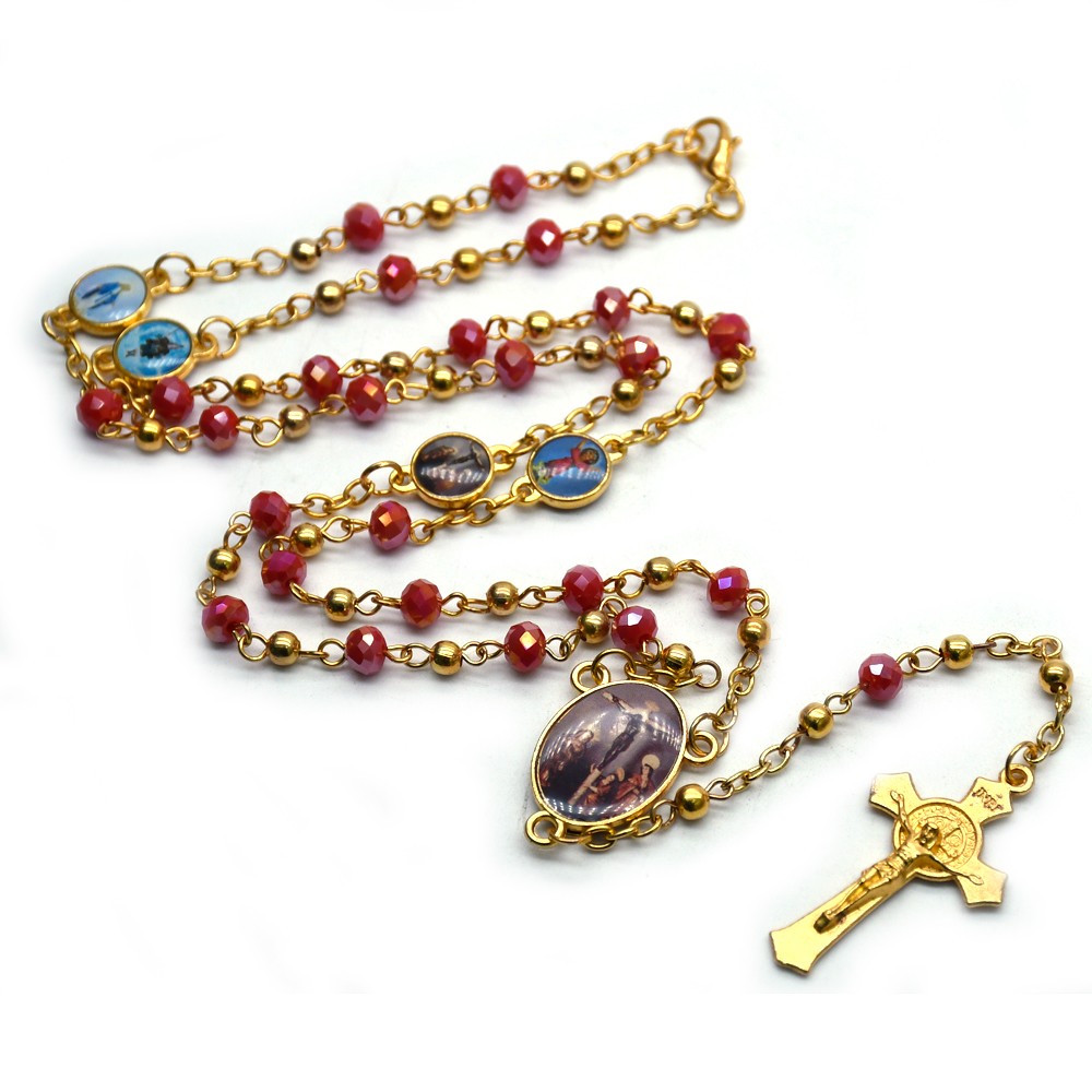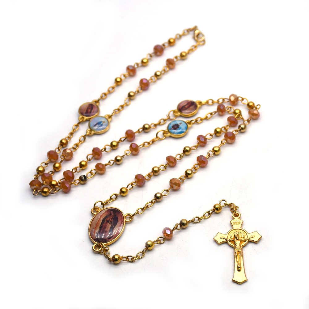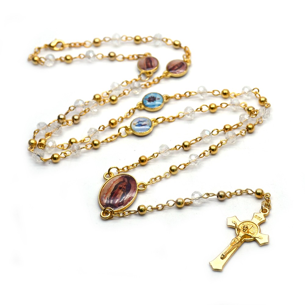 (黑色)四圣像貼圖金屬珠水晶念珠十字架項鏈(圖片隨機)