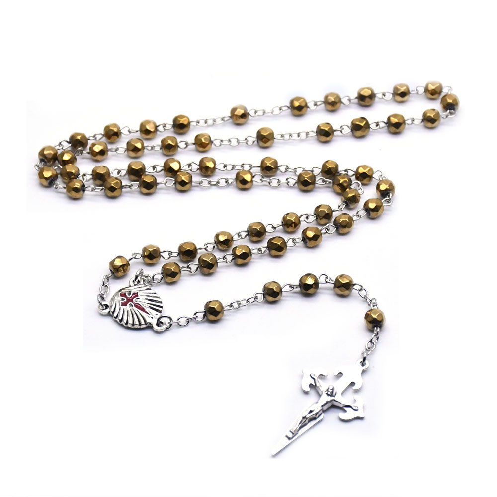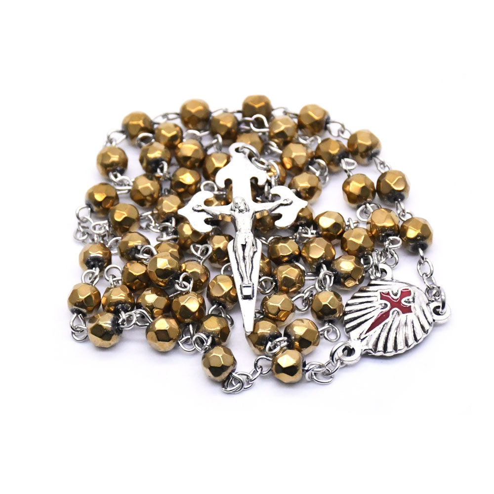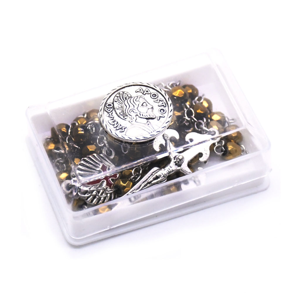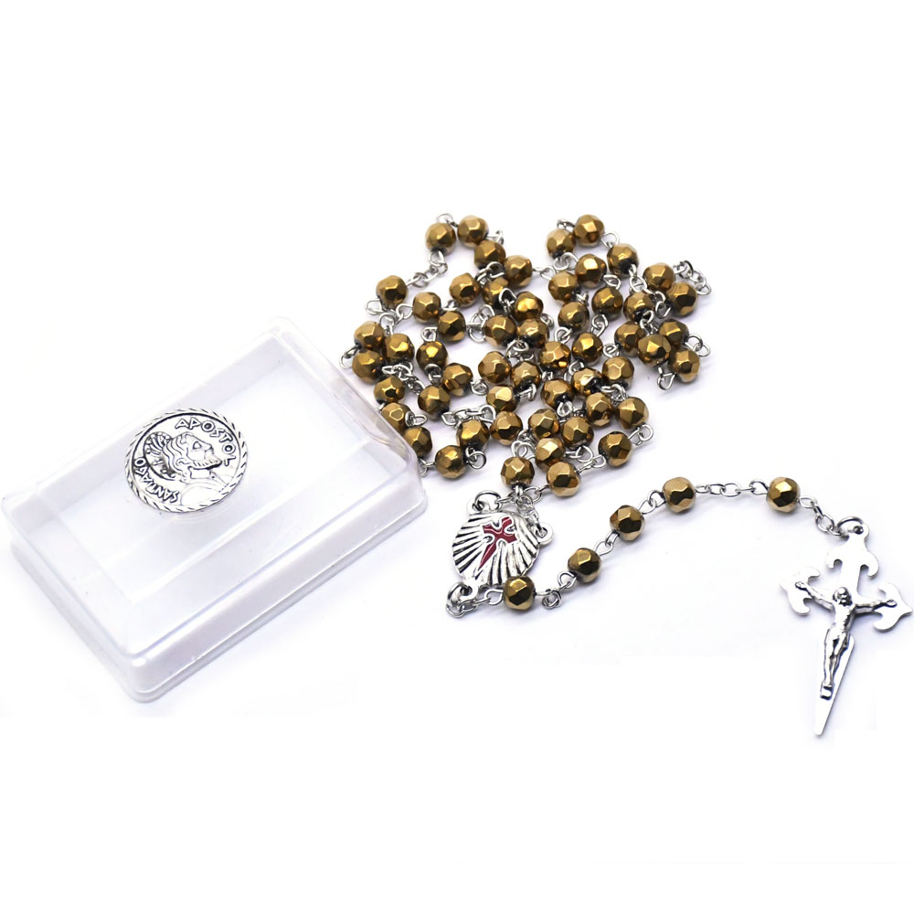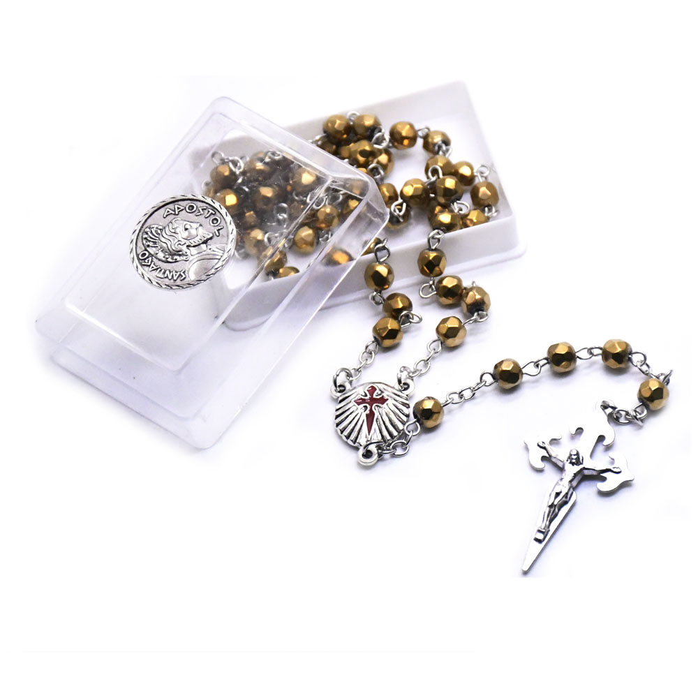 盒裝6mm金光水晶十字架念珠項鏈圣地亞哥禱告念珠