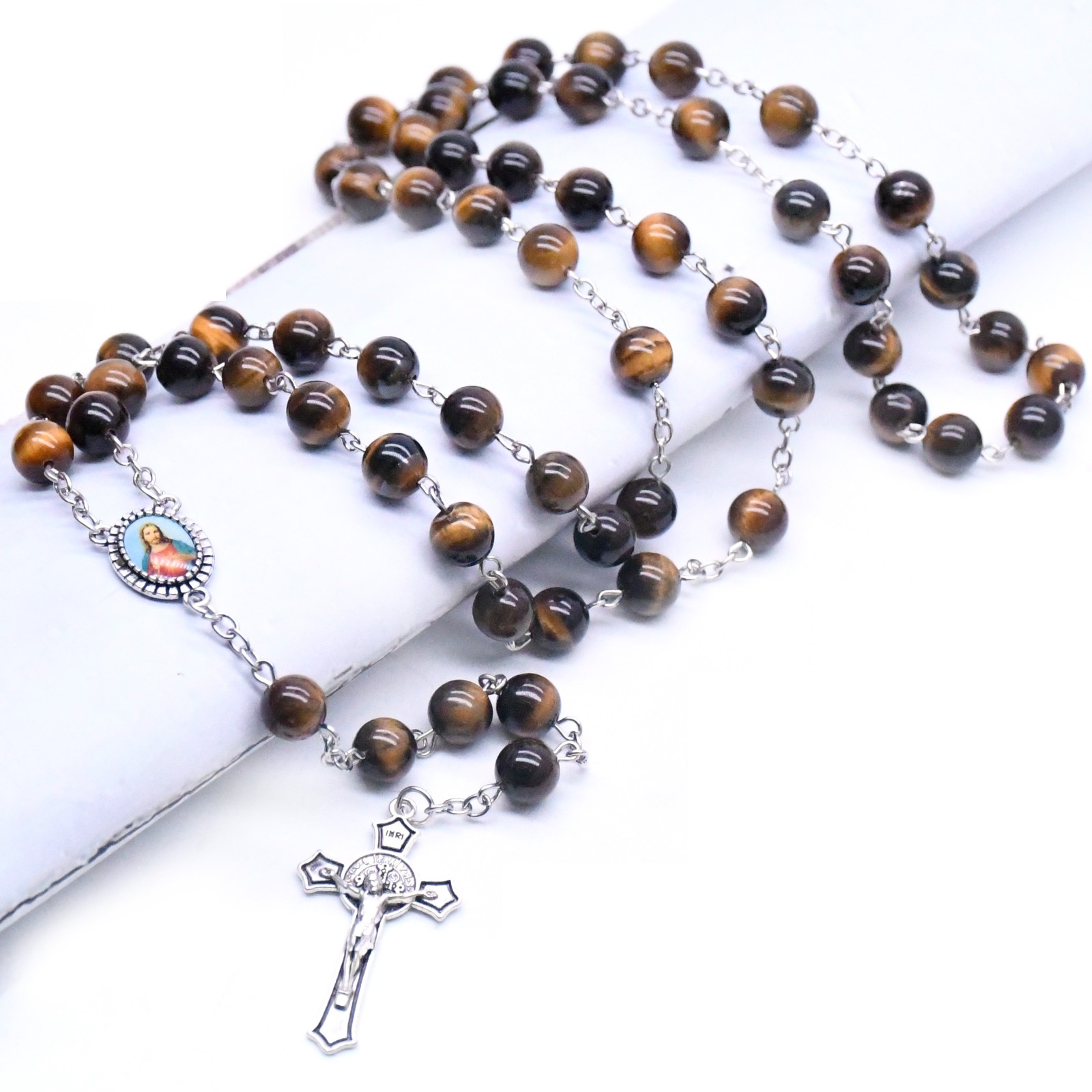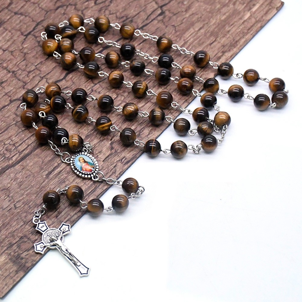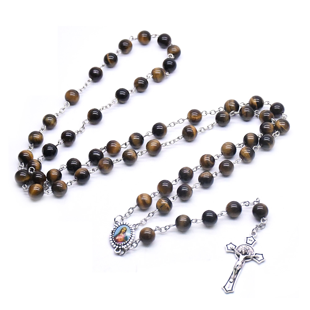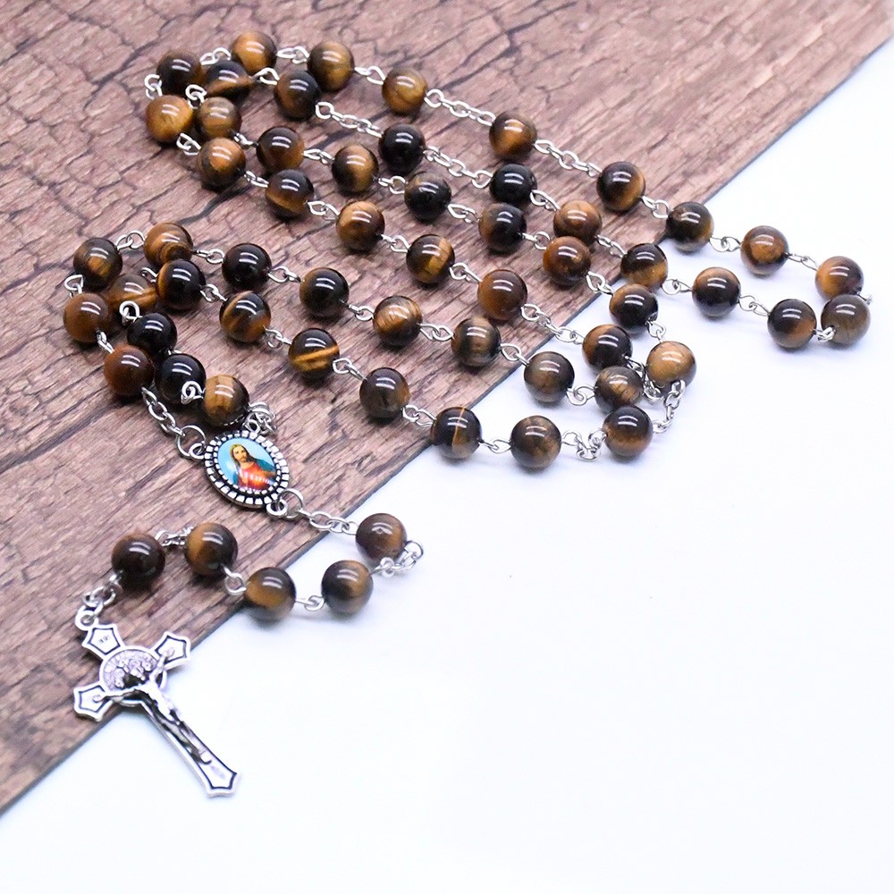 圣誕贈(zèng)品天主教基督教古青銅歐美復(fù)古圖畫石十字架飾品念珠項(xiàng)鏈