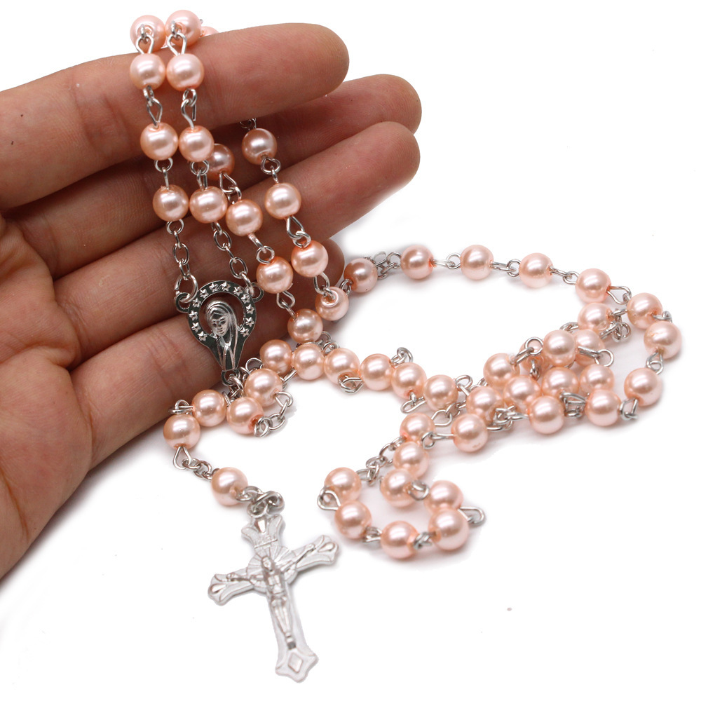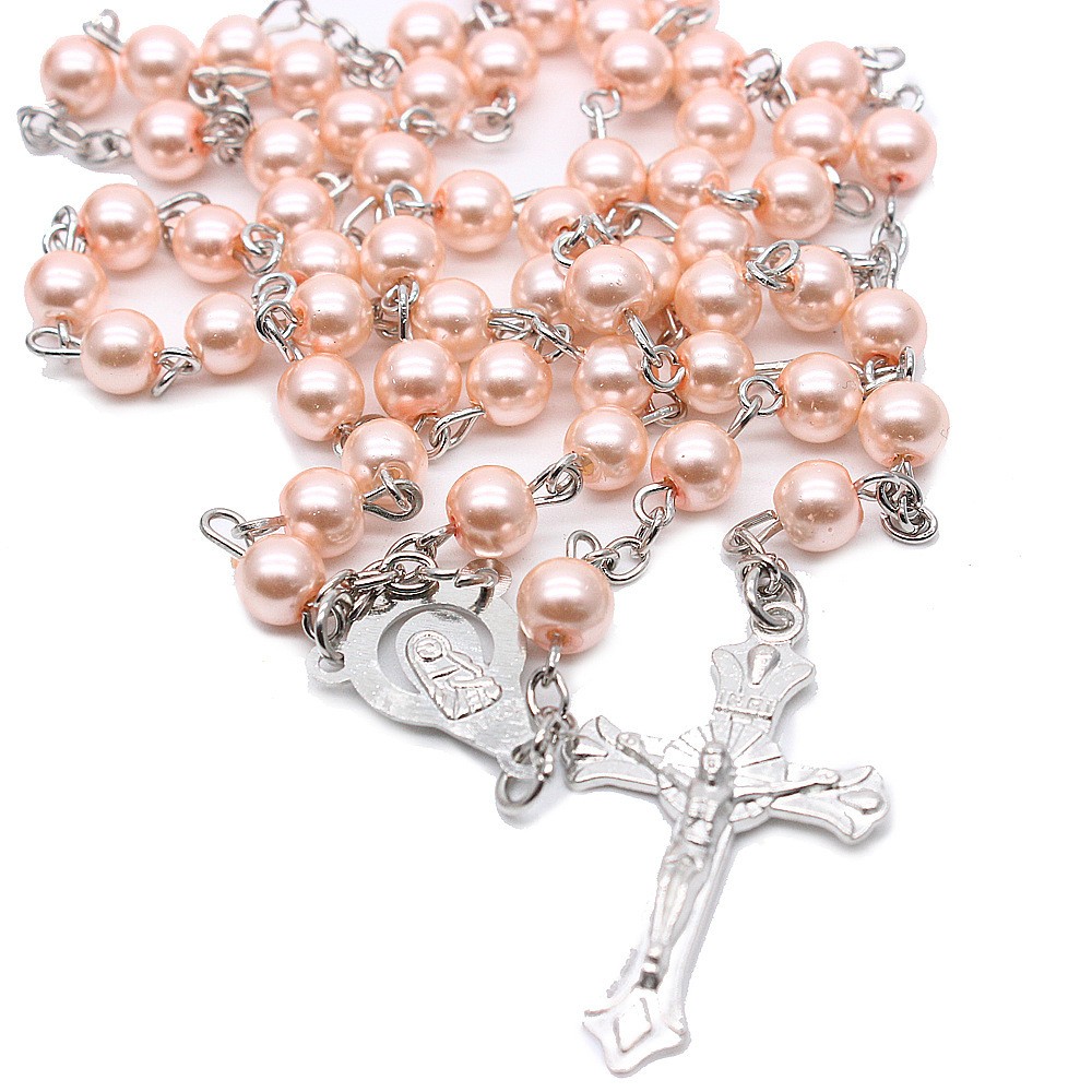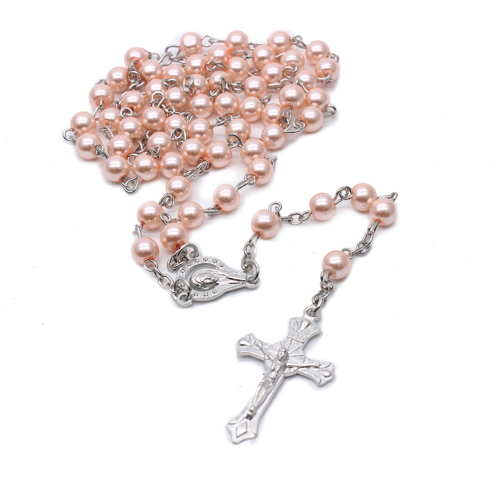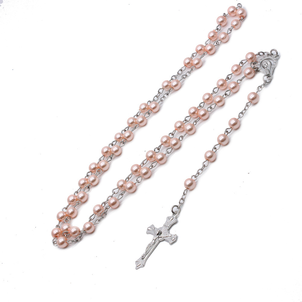 (粉色)6mm珍珠念珠十字架項鏈婚禮珠毛衣鏈珠鏈計數(shù)鏈