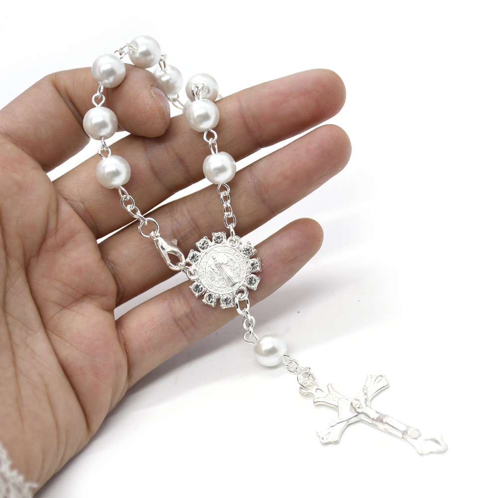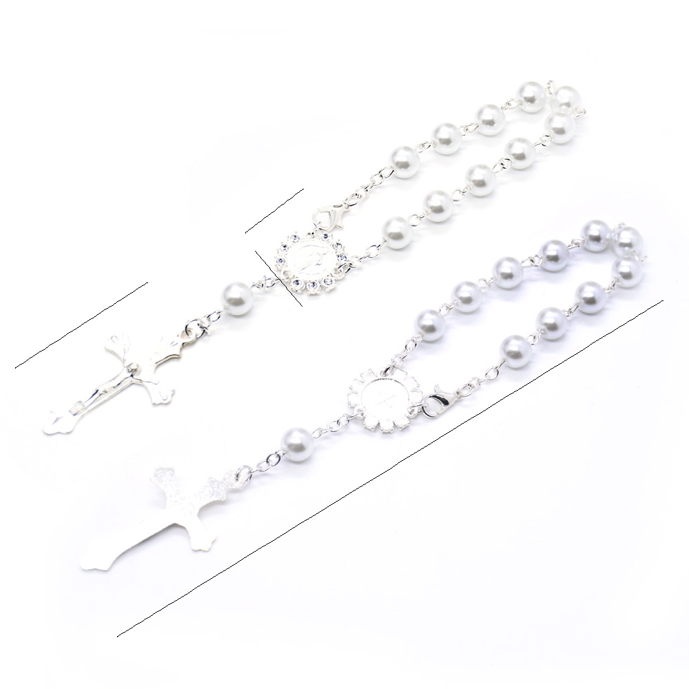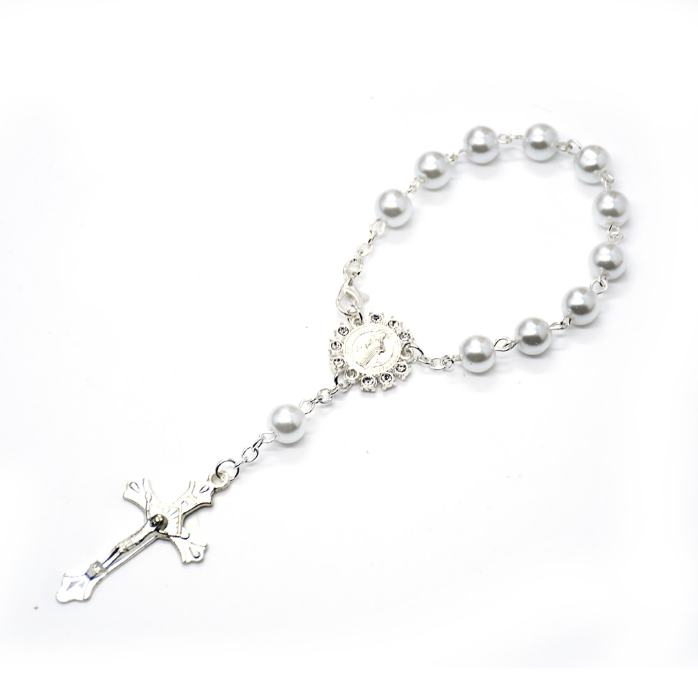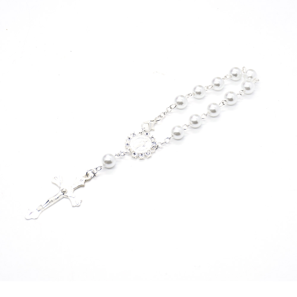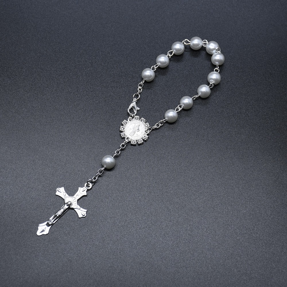 (銀色白K)車掛十字珠念珠洗禮珠十字架手鏈Rosary bracelet