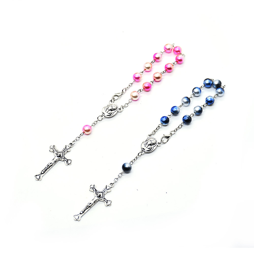 外貿(mào)跨境電商玫瑰十字架粉色念珠手鏈車掛