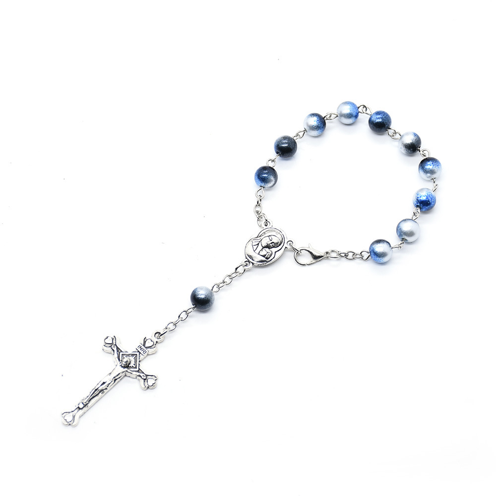 跨境爆款配飾念珠手鏈幻彩寶藍粉珠十字架手鏈